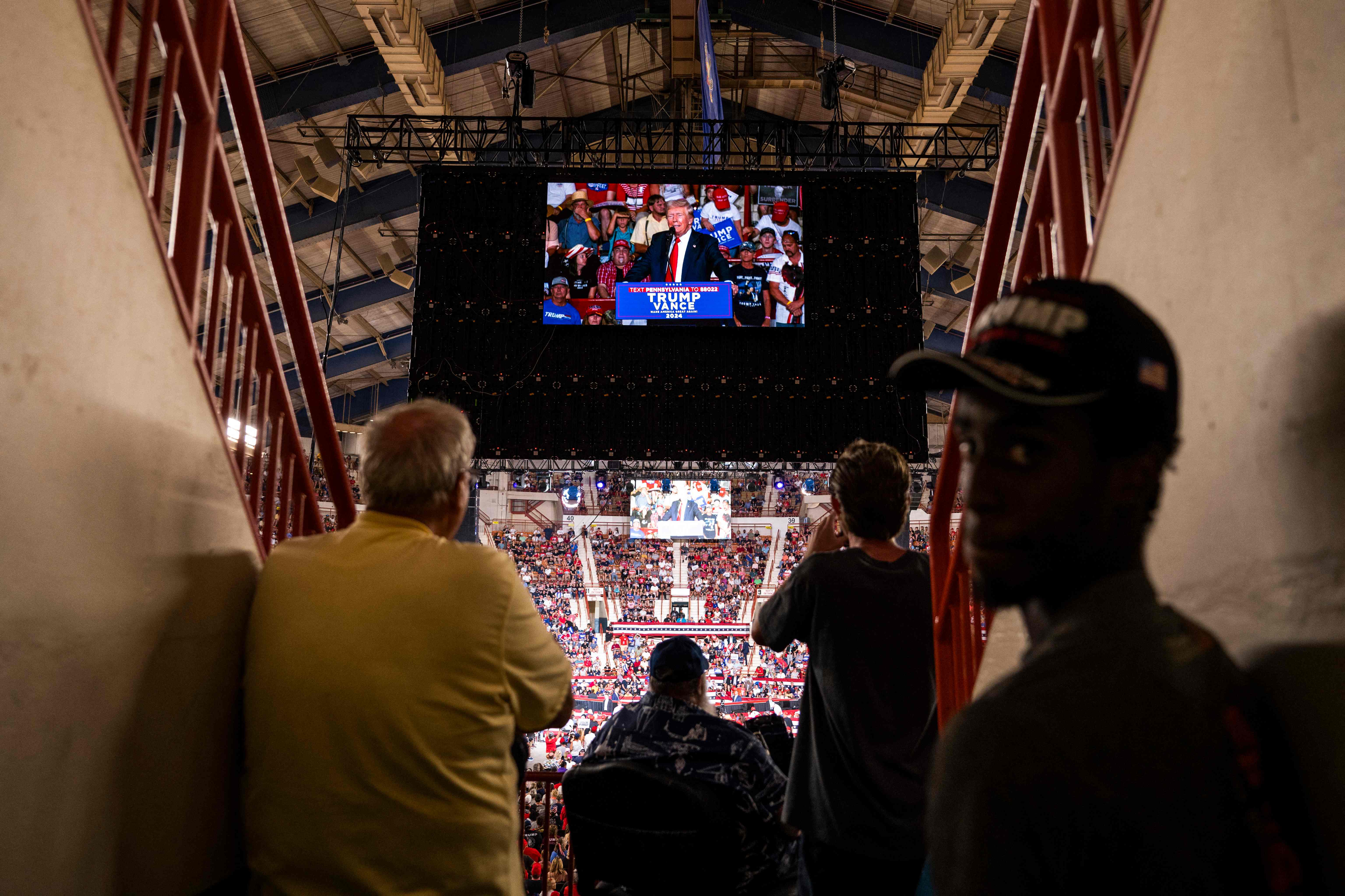 Attendees watch former US President and 2024 Republican presidential candidate Donald Trump speak at a campaign rally at the New Holland Arena in Harrisburg, Pennsylvania, on July 31, 2024. (Photo by Joe Lamberti/AFP Photo)