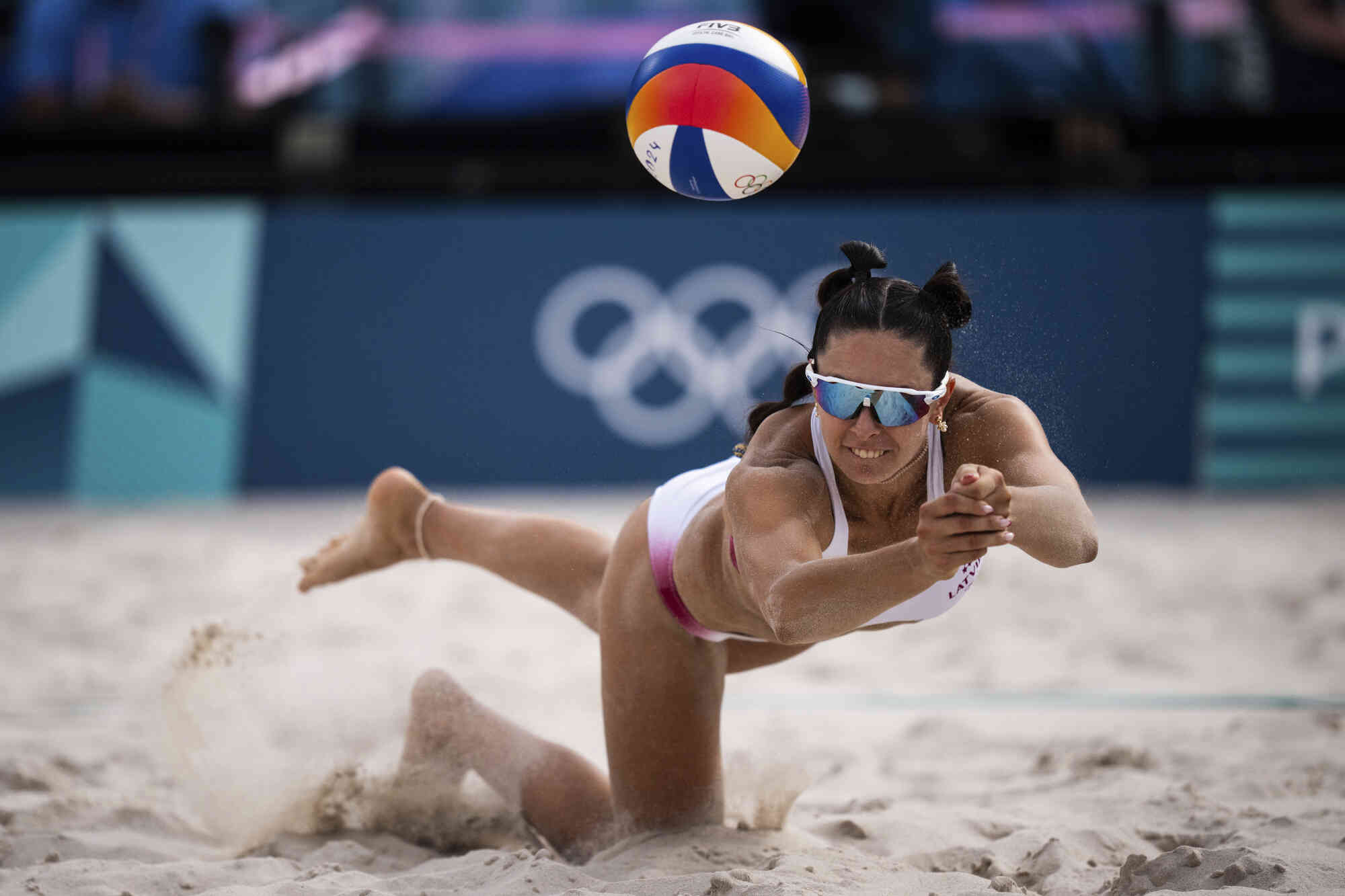 Latvia's Anastasija Samoilova dives for the ball during the women's pool D beach volleyball match between Canada and Latvia at Eiffel Tower Stadium at the 2024 Summer Olympics, Saturday, August 3, 2024, in Paris, France. (Photo by Louise Delmotte/AP Photo)
