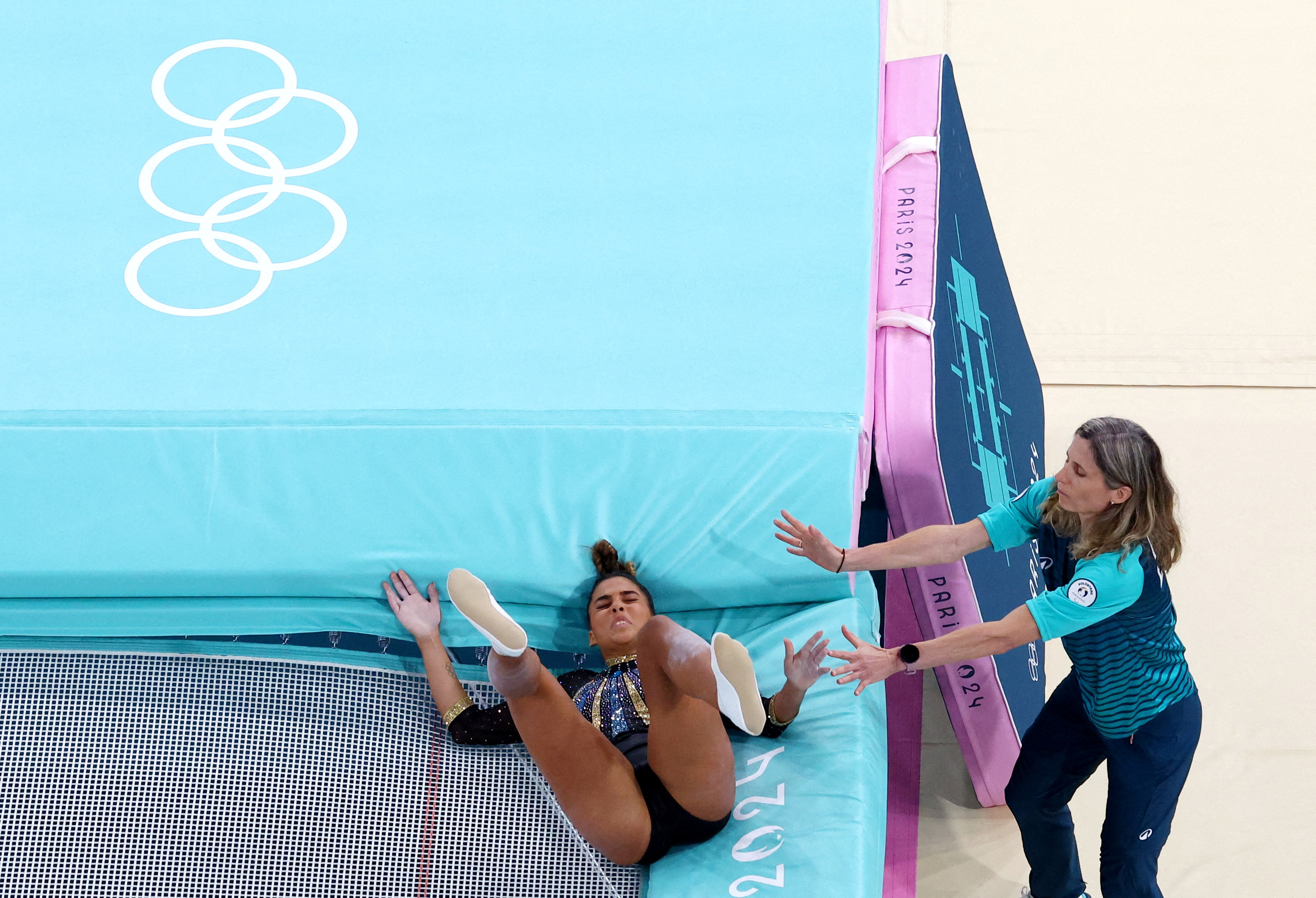 Malak Hamza of Egypt reacts after falling during the women's trampoline qualifications on August 2, 2024. (Photo by Athit Perawongmetha/Reuters)