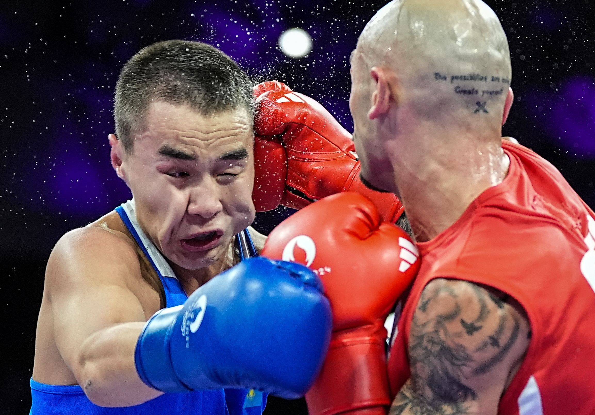 Lasha Guruli (R) of Georgia competes with Bazarbay Uulu Mukhammedsabyr of Kazakhstan during the men's 63.5kg quarterfinal of boxing at the Paris 2024 Olympic Games in Paris, France, August 1, 2024. (Photo by Xinhua News Agency/Rex Features/Shutterstock)