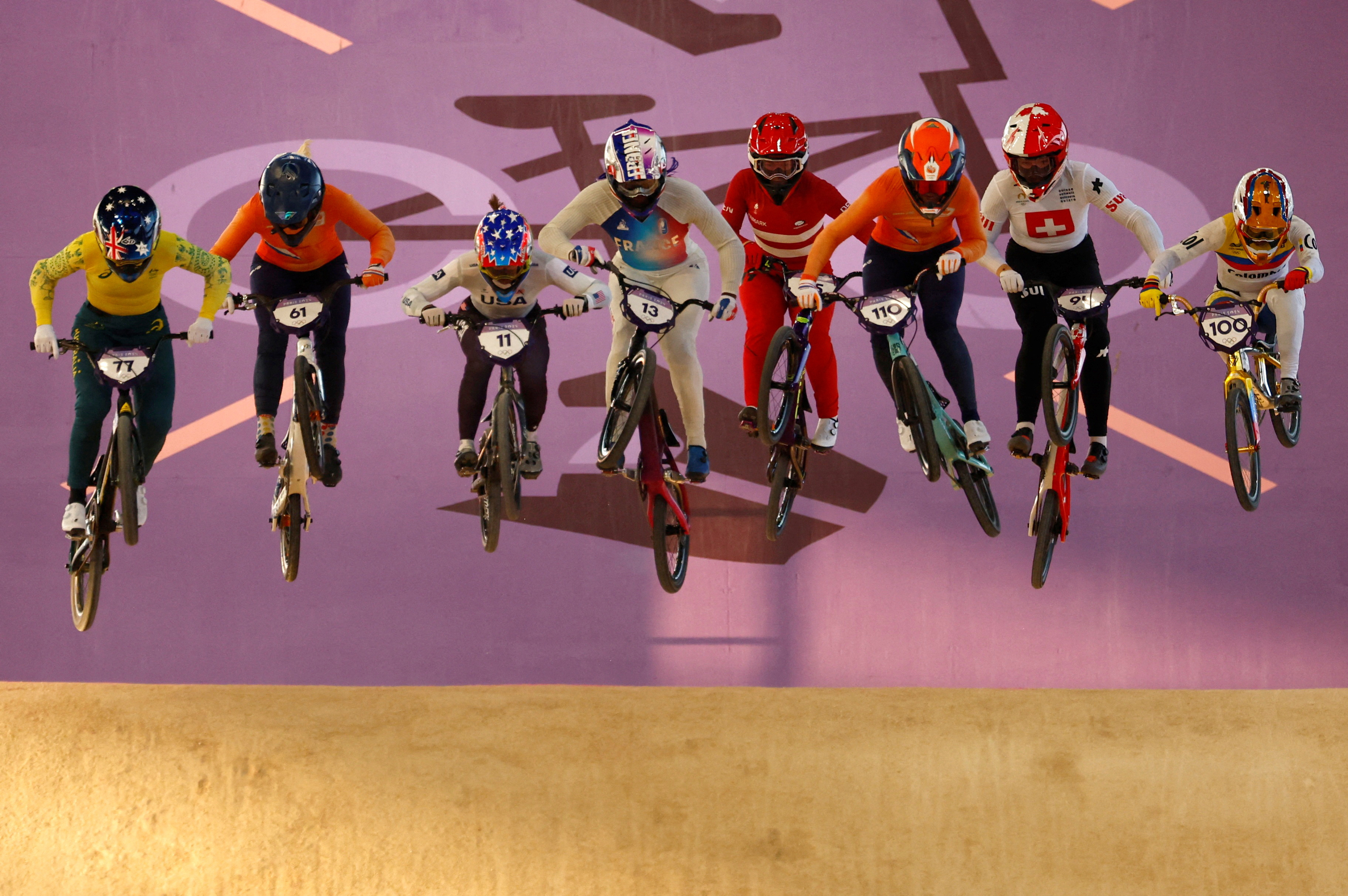 Athletes in action during heat 1 of the women's BMX semifinals run on August 2, 2024. (Photo by Gonzalo Fuentes/Reuters)