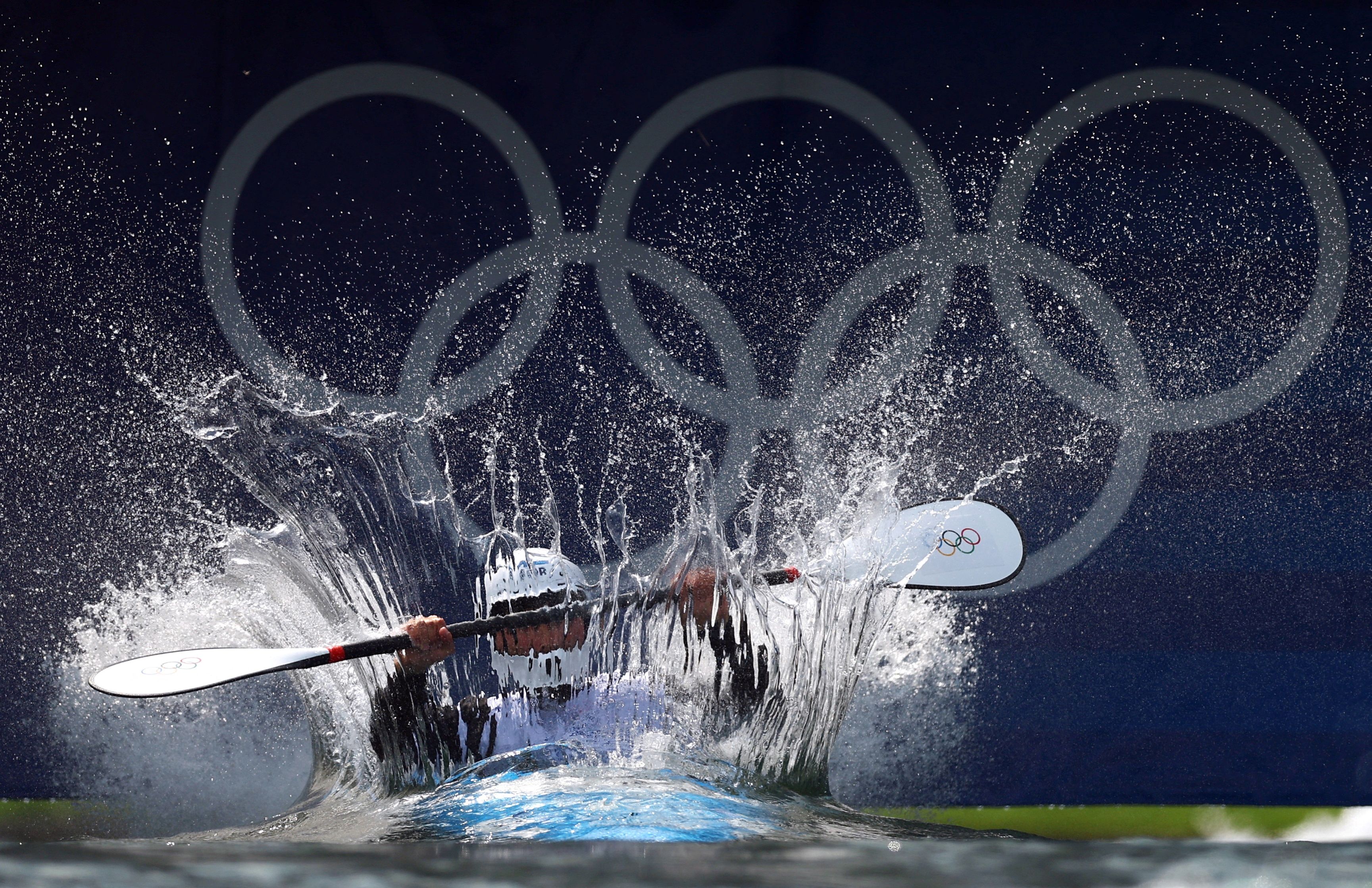 Amir Rezanejad of the Refugee Olympic Team in action during the men's kayak cross time trial on August 2, 2024. (Photo by Molly Darlington/Reuters)