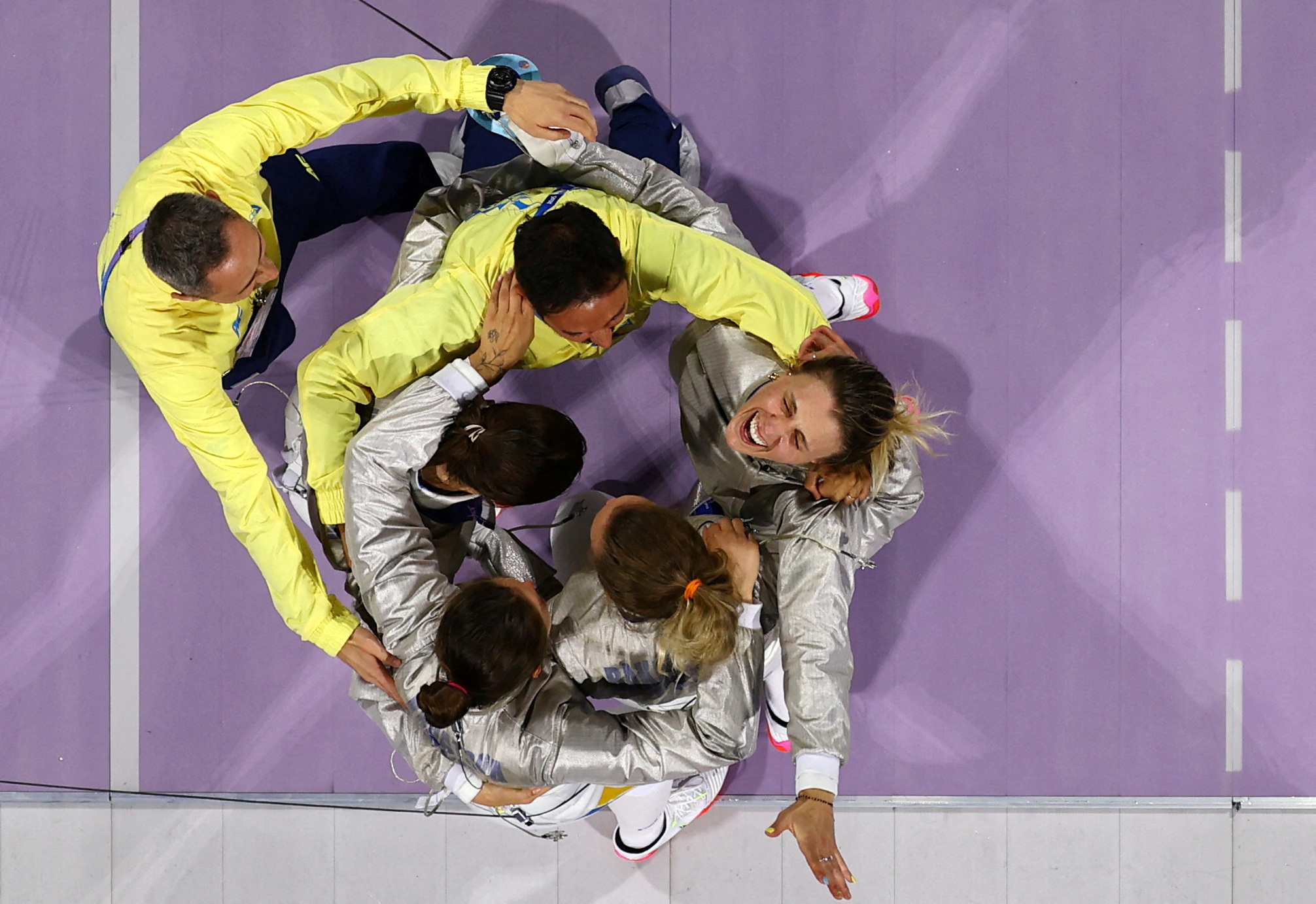 An overview shows Ukraine's Olga Kharlan (top R) celebrating with teammates after winning in the women's sabre team gold medal bout between South Korea and Ukraine during the Paris 2024 Olympic Games at the Grand Palais in Paris, on August 3, 2024. (Photo by Albert Gea/Reuters)