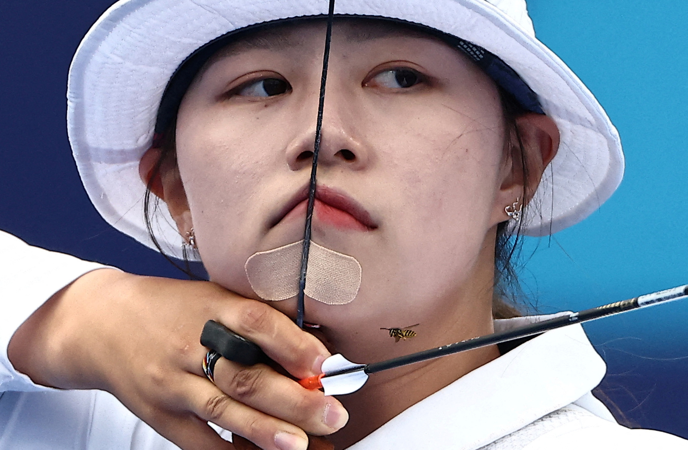 South Korea's Lim Sihyeon competes during the archery women's individual elimination round during the Paris 2024 Olympic Games at the Esplanade des Invalides in Paris on August 3, 2024. (Photo by Tingshu Wang/Reuters)
