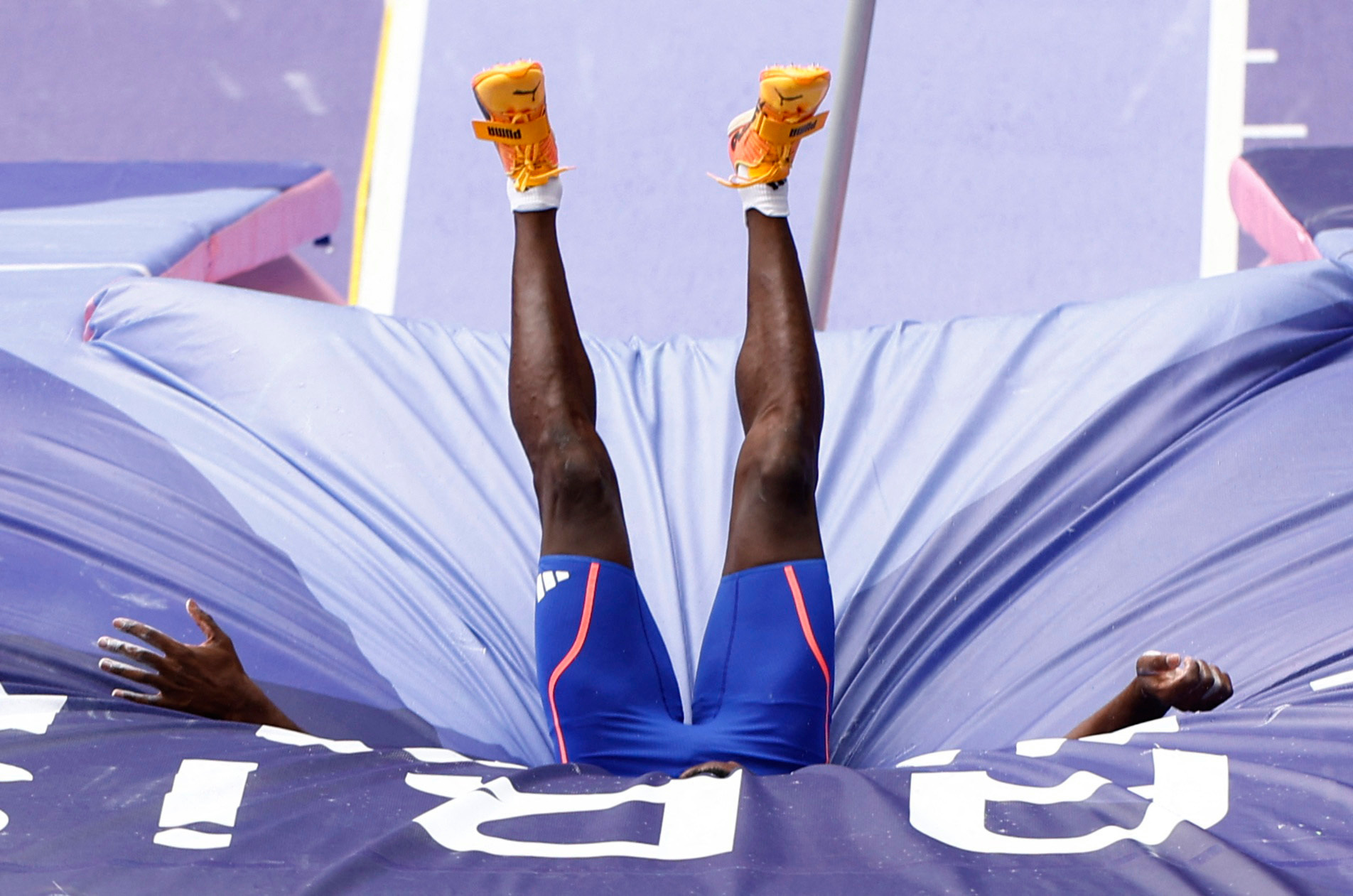 Makenson Gletty of France is swallowed up by the soft landing pad after his pole vault attempt in the men’s decathlon at Stade de France ib Saint-Denis, France on August 03, 2024. (Photo by Alina Smutko/Reuters)