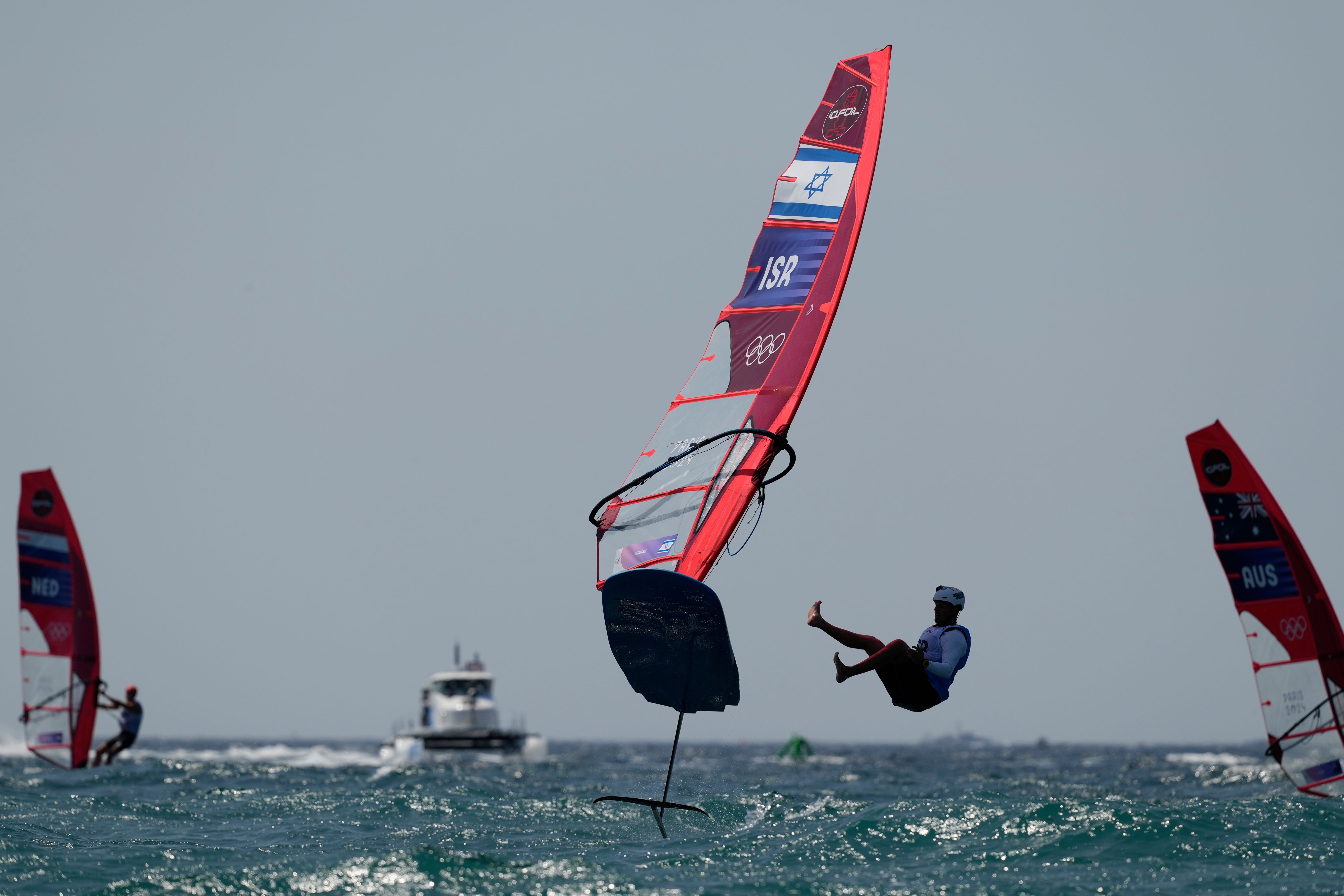 Tom Reuveny of Israel jumps from his iQFOiL windsurfer after finishing first in the final race to win the men's iQFOiL windsurfing class gold medal ahead of Grae Morris of Australia and Luuc van Opzeeland of the Netherlands during the 2024 Summer Olympics, Saturday, August 3, 2024, in Marseille, France. (Photo by Carolyn Kaster/AP Photo)