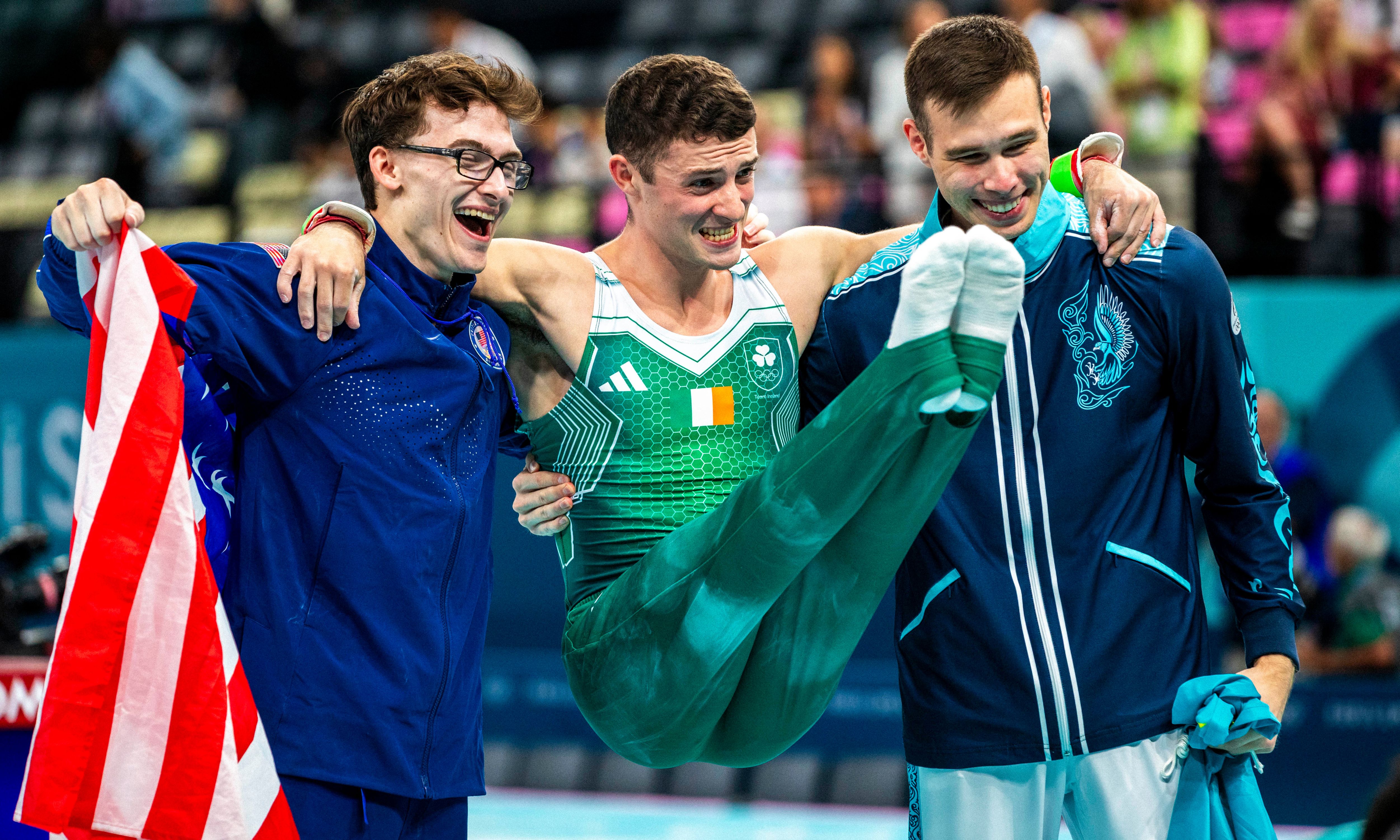 Bronze medalist Stephen Nedoroscik of Team United States, Gold medalist Rhys McClenaghan of Team Ireland and Silver medalist Nariman Kurbanov of Team Kazakhstan pose for a photo after competing during the Artistic Gymnastics Men's Pommel Horse Final on day eight of the Olympic Games Paris 2024 at Bercy Arena on August 03, 2024 in Paris, France. (Photo by Ed Alcock/The Observer)