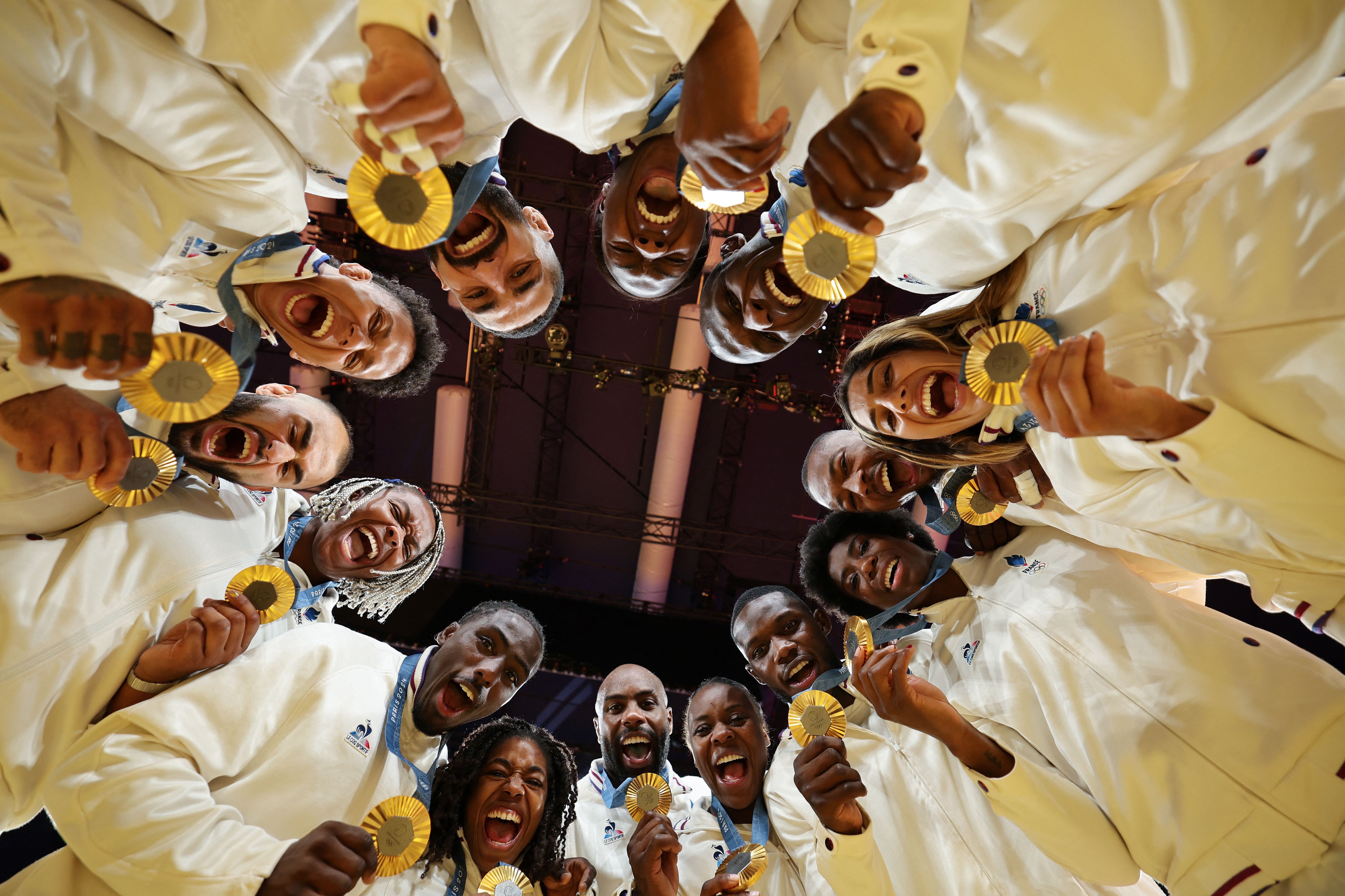 Gold medallists team France pose for a photo after the podium of the judo mixed team event at the Paris 2024 Olympic Games in the Champ-de-Mars Arena, in Paris on August 3, 2024. (Photo by Jack Guez/AFP Photo)