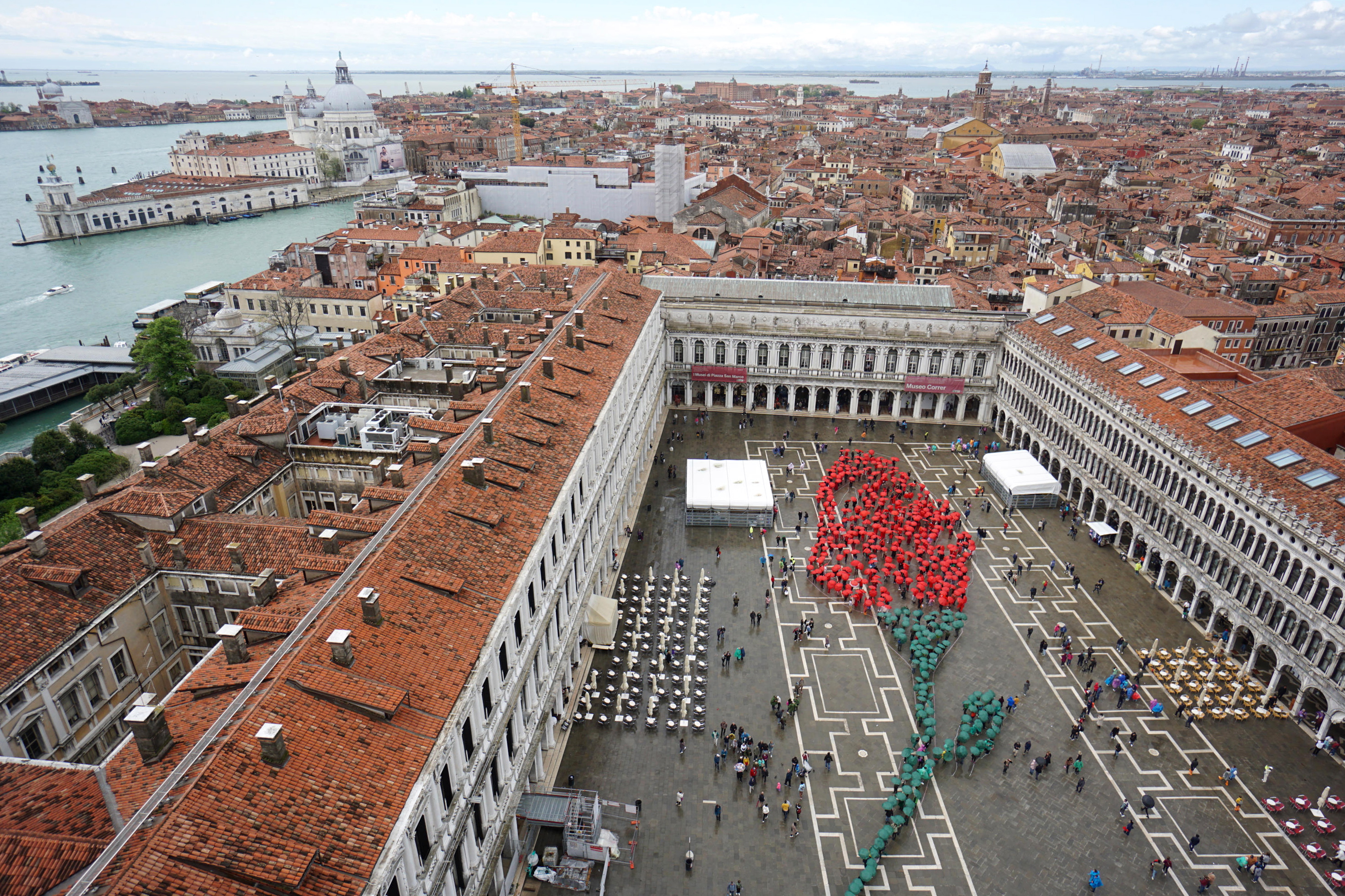 A huge “Bocolo” (rosebud) made by hundreds of figures and organized by the Venetian artist Elena Tagliapietra for the feast of San Marco is seen from the top of the bell tower of San Marco in Venice, Italy, 25 April 2023. The patron saint of the city, San Marco Evangelista, is celebrated on 25 April in Venice. (Photo by Andrea Merola/EPA)