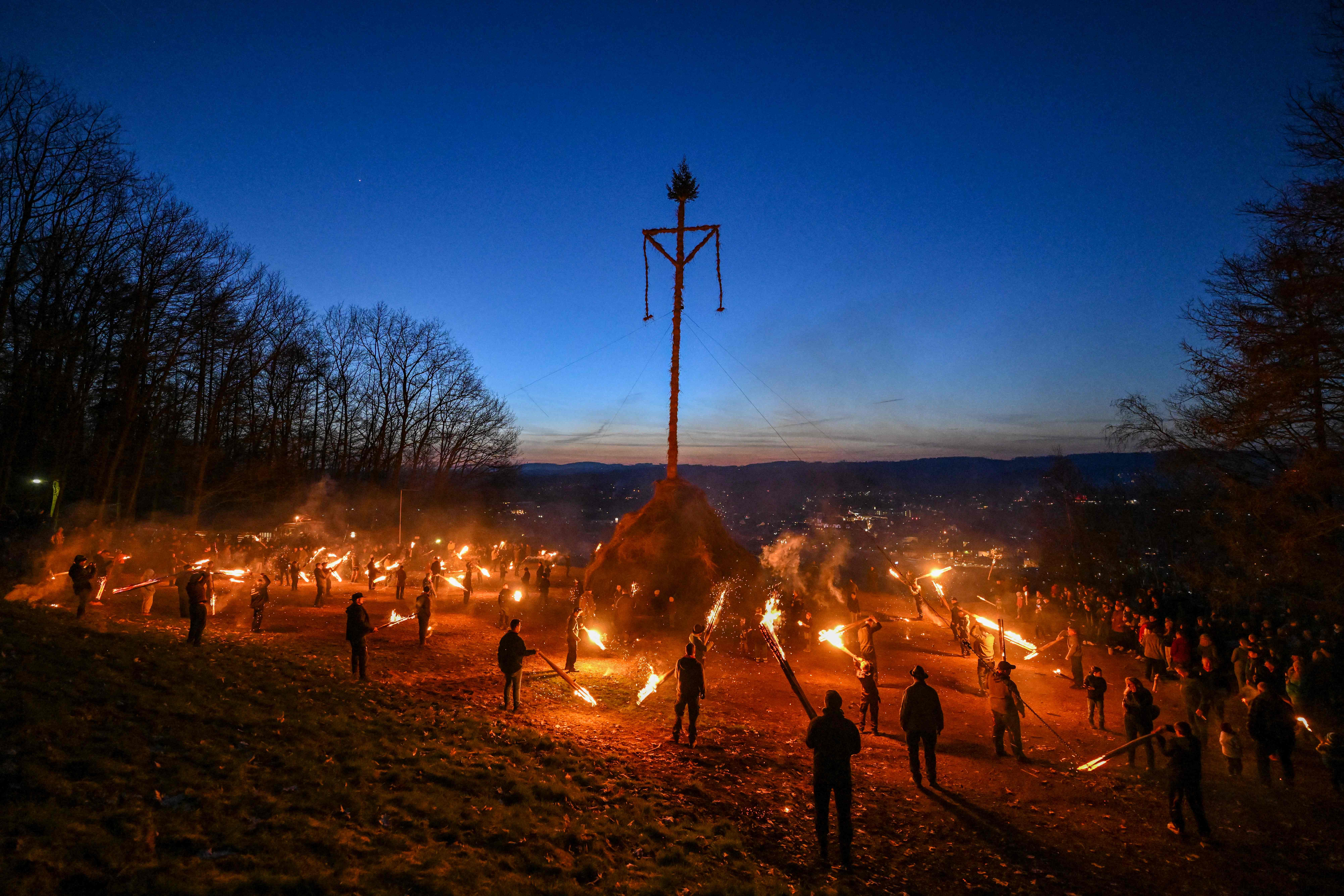 People light the Easter fire with burning torches on a hill in Attendorn, western Germany on April 9, 2023. Easter fires are traditionally lit all over Germany on Easter Saturday and Sunday. In Attendorn, Easter fires with huge crosses are burned on four hills. In addition, burning torches are waved, with which fire circles are painted in the air. (Photo by Ina Fassbender/AFP Photo)