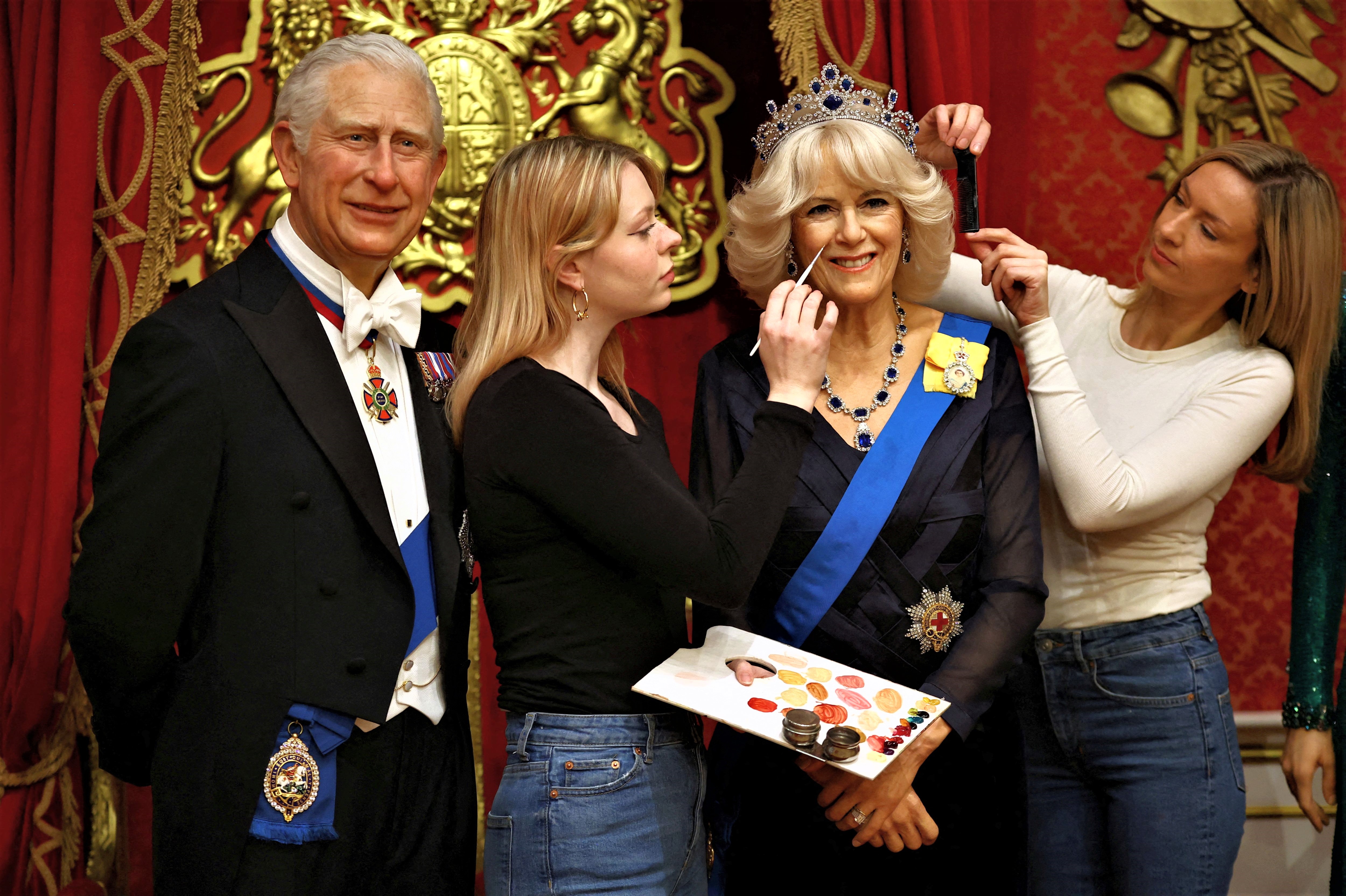Studio assistants retouch a new waxwork representation of Britain's Queen Consort Camilla as it stands next to a waxwork representation of Britain’s King Charles as part of the new attraction “The Royal Palace” experience, ahead of The Coronation celebrations, at Madame Tussauds in London, Britain on April 26, 2023. (Photo by Hannah McKay/Reuters)