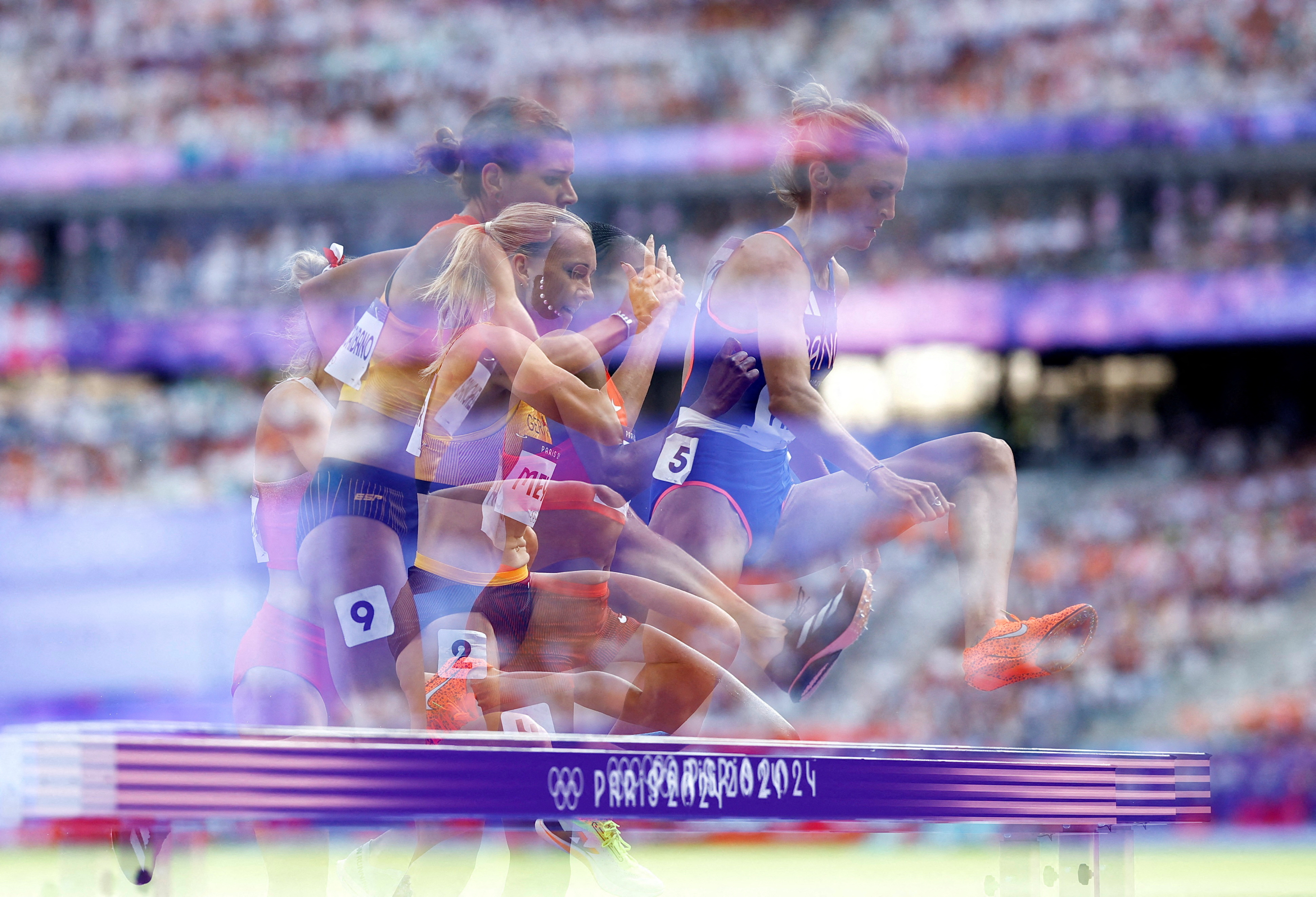 Irene Sanchez-Escribano of Spain, Lea Meyer of Germany and Alice Finot of France compete in the women's 3000m steeplechase heat of the athletics event at the Paris 2024 Olympic Games at Stade de France in Saint-Denis, north of Paris, on August 4, 2024. (Photo by Sarah Meyssonnier/Reuters)