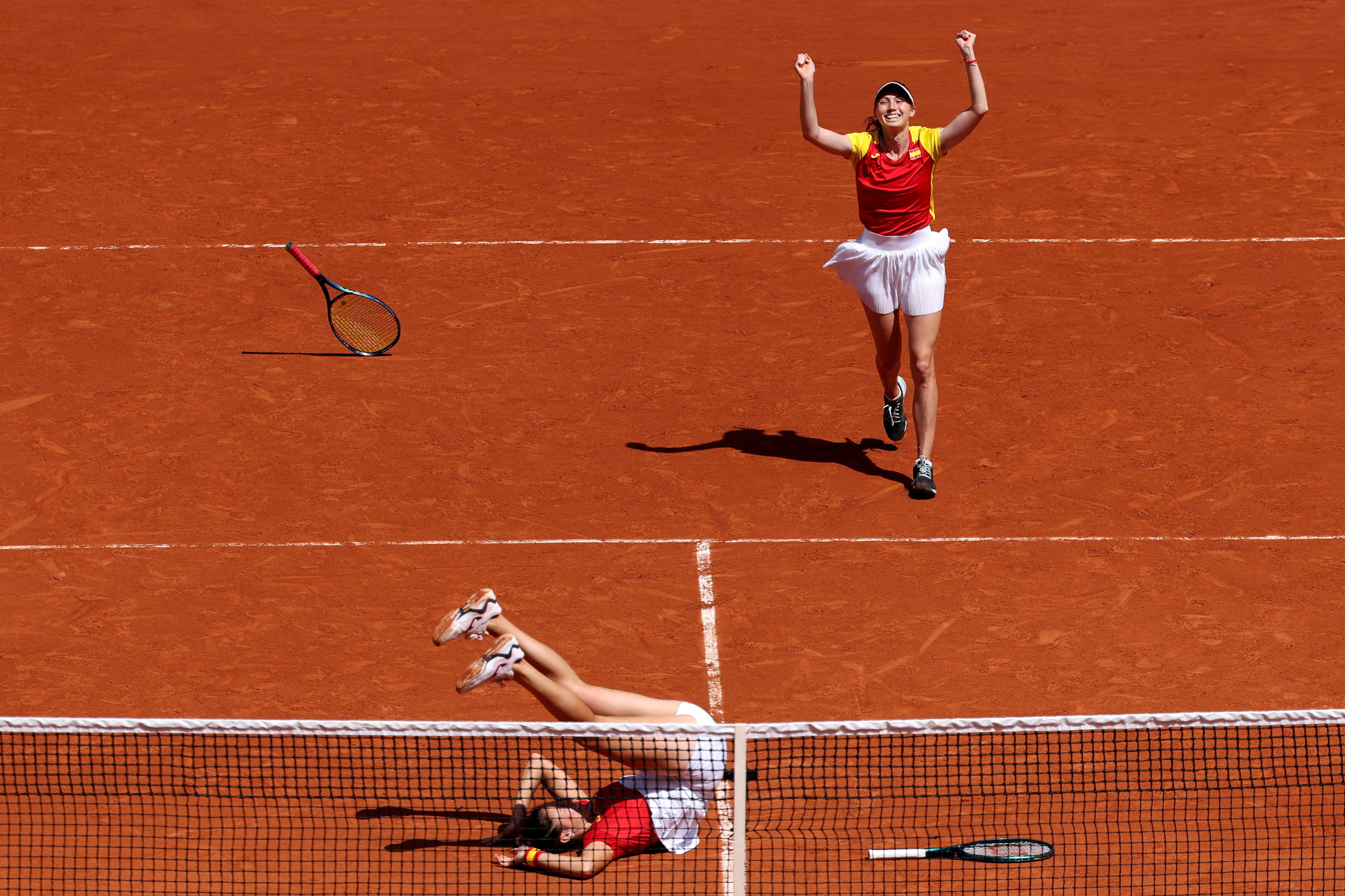 Cristina Bucsa and Sara Sorribes Tormo of Spain celebrate after winning bronze against Karolina Muchova and Linda Noskova of Czech Republic iin their women's doubles bronze medal tennis match on Court Philippe-Chatrier at the Roland-Garros Stadium during the Paris 2024 Olympic Games, in Paris on August 4, 2024. (Photo by Claudia Greco/Reuters)