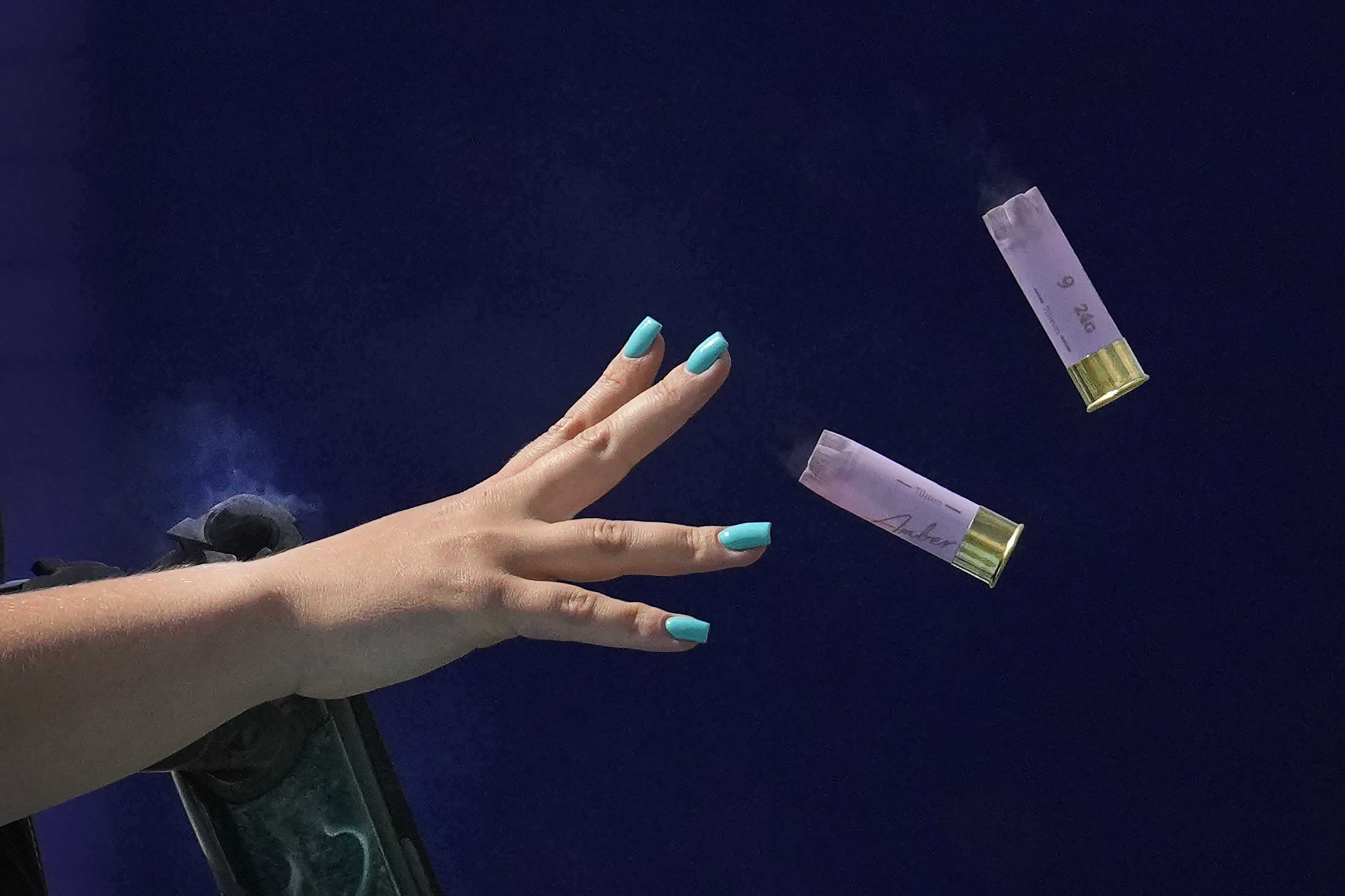 Britain's Amber Jo Rutter ejects empty cartridges from her gun as she competes in the Skeet women's final at the 2024 Summer Olympics, Sunday, August 4, 2024, in Chateauroux, France. (Photo by Manish Swarup/AP Photo)