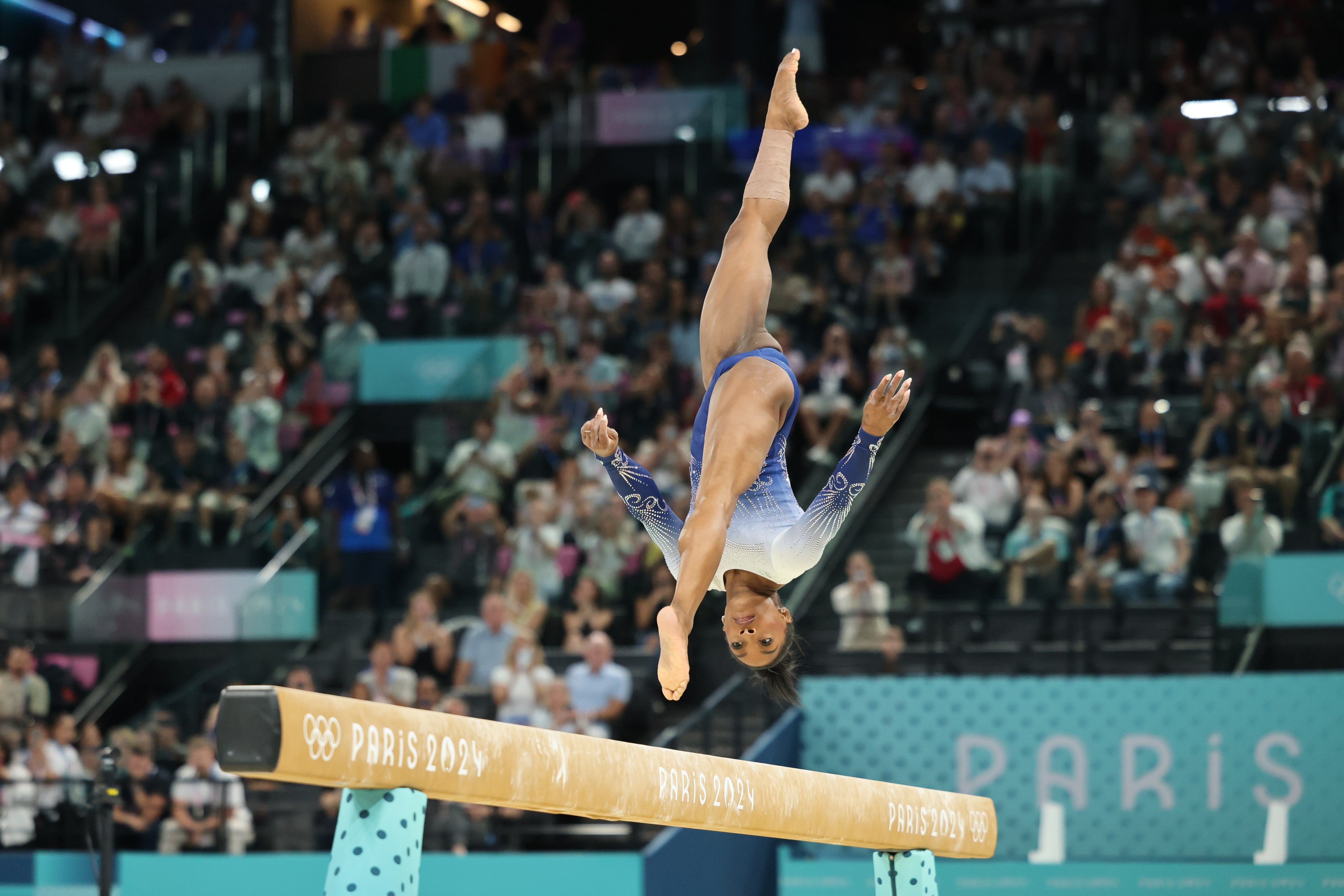 Simone Biles of Team United States competes during the Artistic Gymnastics Women's Balance Beam Final on day ten of the Olympic Games Paris 2024 at Bercy Arena on August 05, 2024 in Paris, France. A fall meant that she finished without a medal, but she claimed silver in the floor competition. (Photo by Jack Hill/The Times)