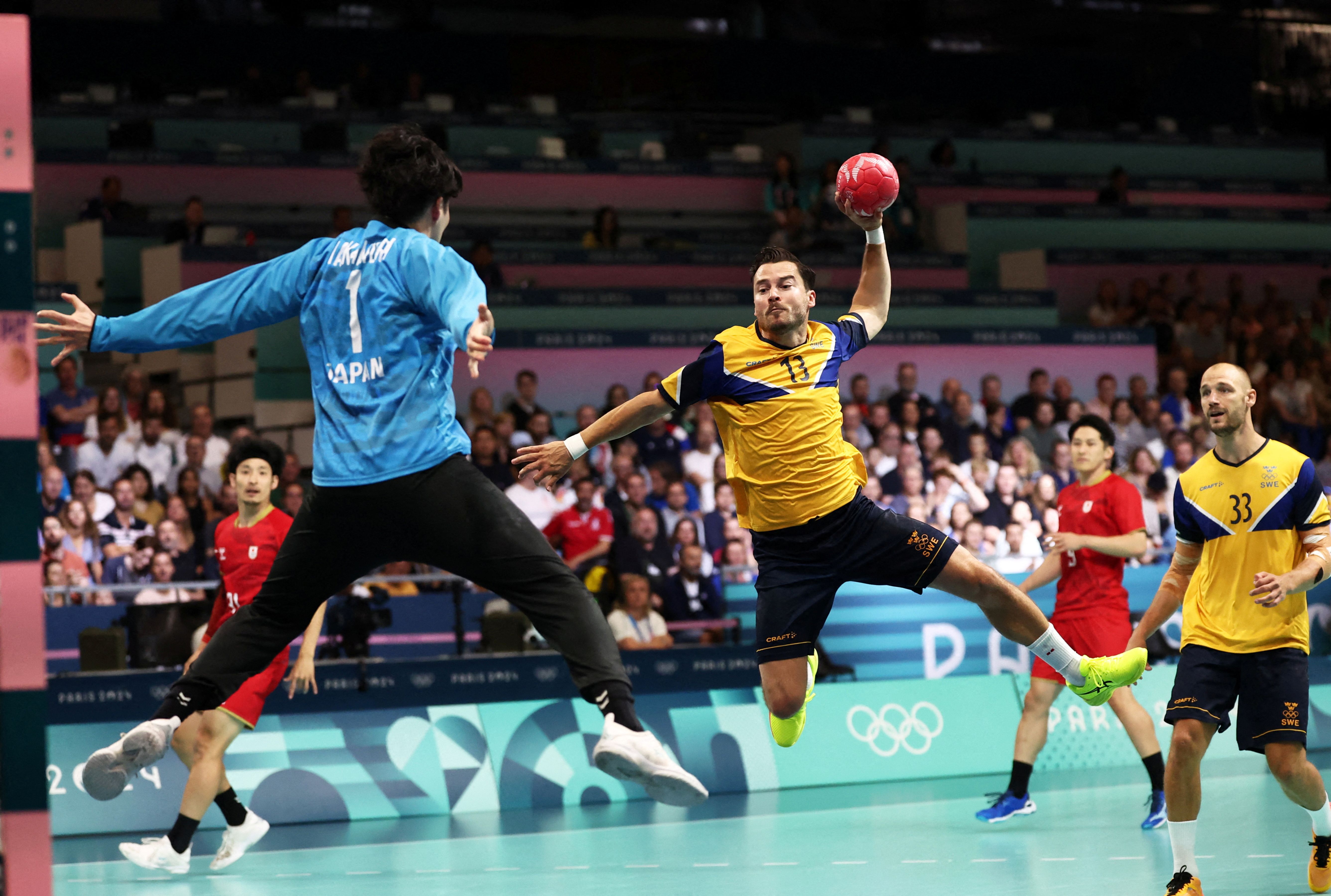 Sebastian Karlsson of Sweden in action with Takumi Nakamura of Japan during Sweden vs Japan in men's preliminary round group A handball on August 4, 2024. (Photo by Eloisa Lopez/Reuters)