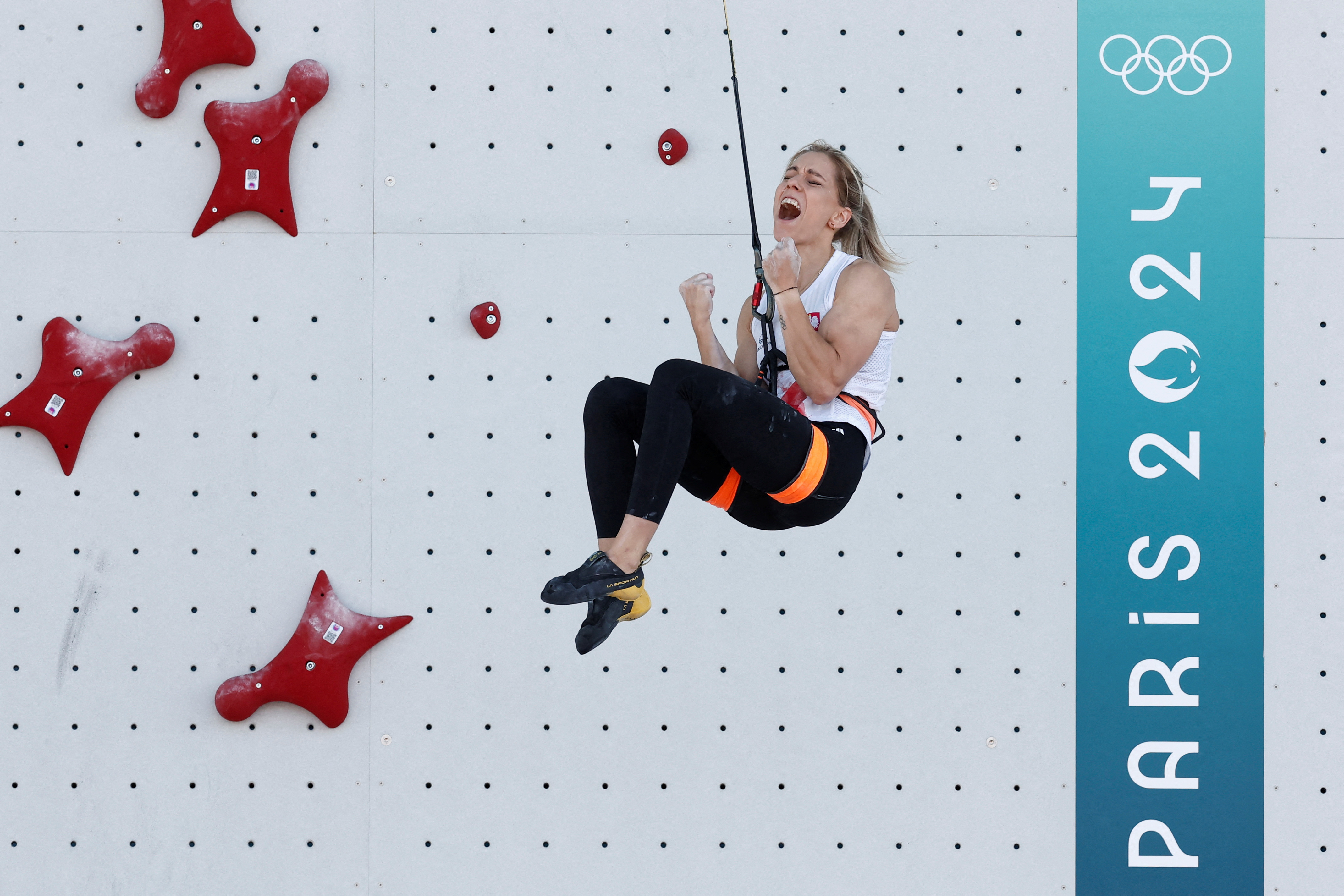 Aleksandra Miroslaw of Team Poland celebrates after her heat and breaking a new world record from her first heat during the Women's Speed Climbing - Seeding Heats on day ten of the Olympic Games Paris 2024 at Le Bourget Sport Climbing Venue on August 05, 2024 in Paris, France. (Photo by Benoit Tessier/Reuters)