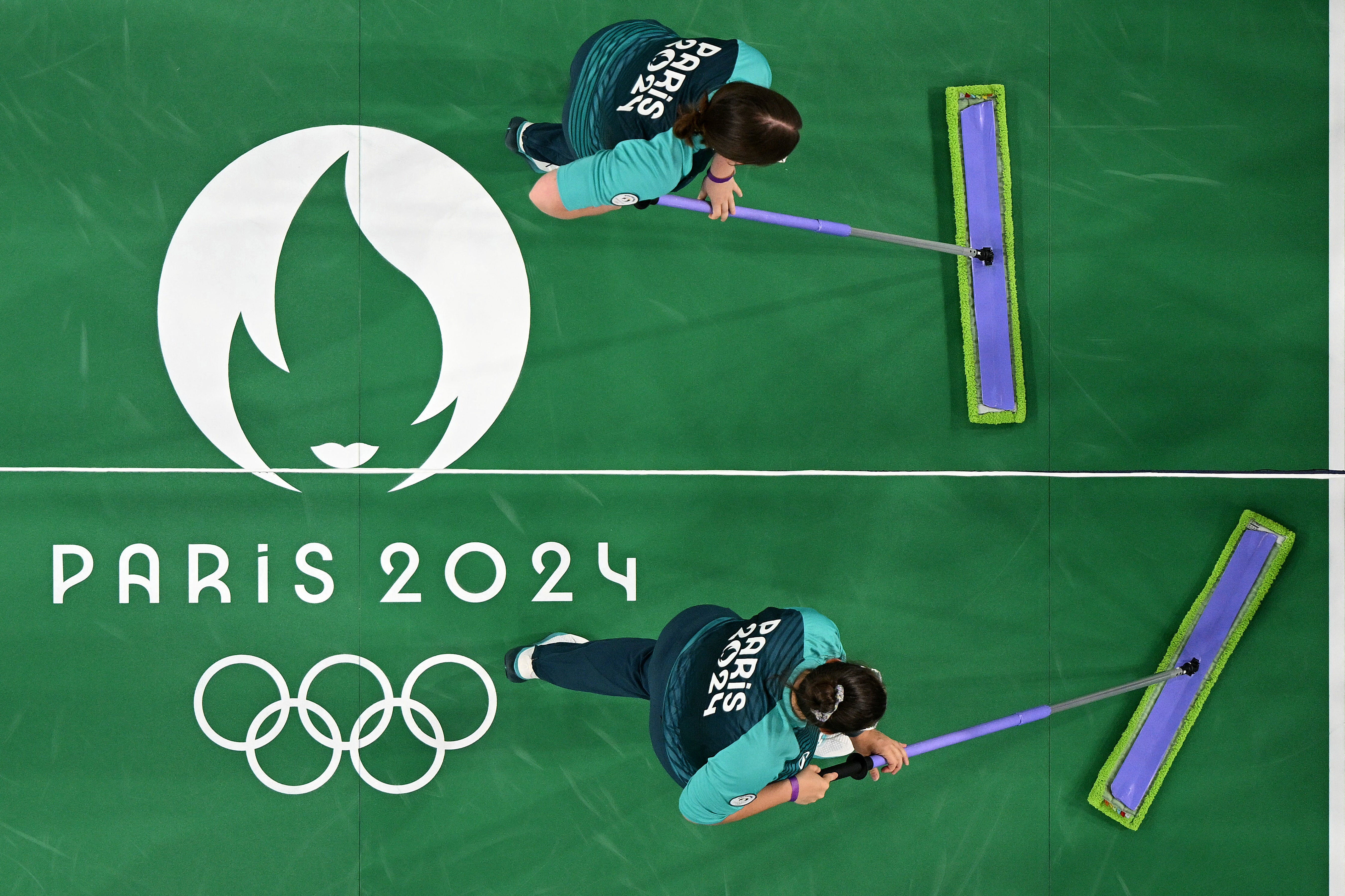 Cleaners mop the court floor in the men's doubles badminton bronze medal match between Denmark and Malaysia during the Paris 2024 Olympic Games at Porte de la Chapelle Arena in Paris on August 4, 2024. (Photo by Antonin Thuillier/AFP Photo)