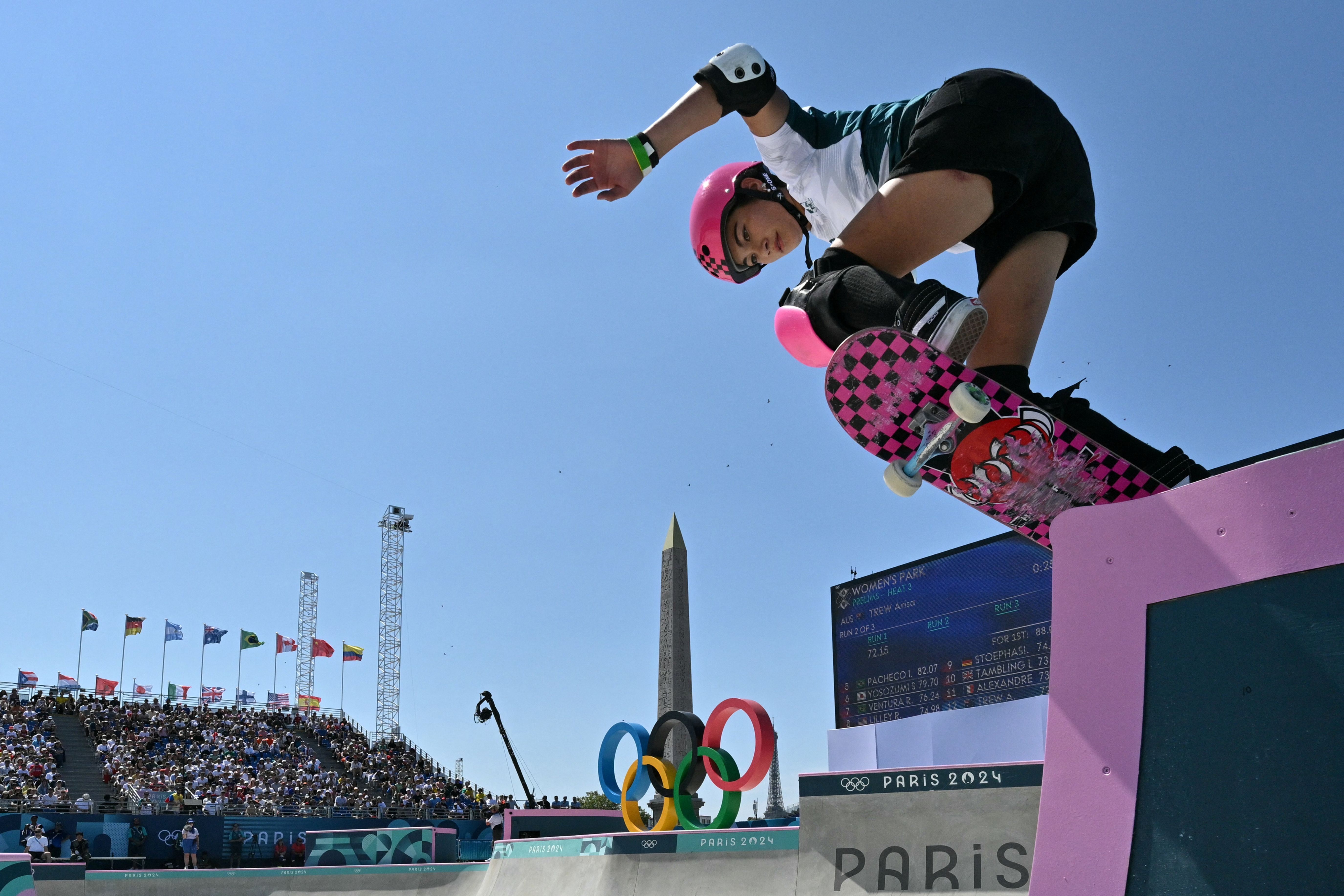 Arisa Trew of Team Australia competes during the Women's Park Final Skateboarding on day eleven of the Olympic Games Paris 2024 at Place de la Concorde on August 6, 2024 in Paris, France. (Photo by Odd Andersen/Reuters)