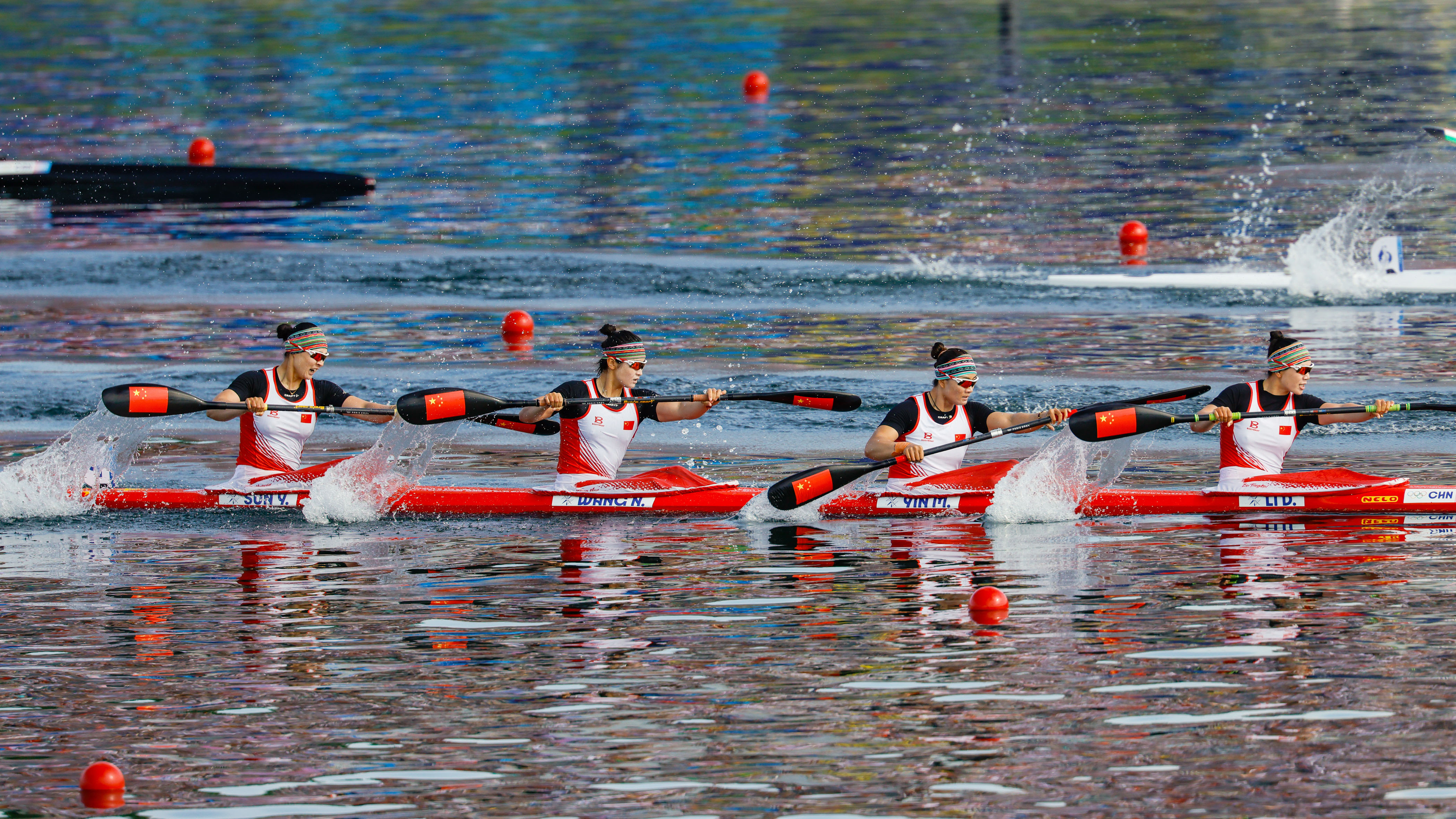 Li Dongyin/Yin Mengdie/Wang Nan/Sun Yuewen (R to L) of China compete during the women's kayak four 500m heats of canoe sprint at the Paris 2024 Olympic Games in Vaires-sur-Marne, France, on Aug. 6, 2024. (Photo by Xinhua News Agency/Rex Features/Shutterstock)