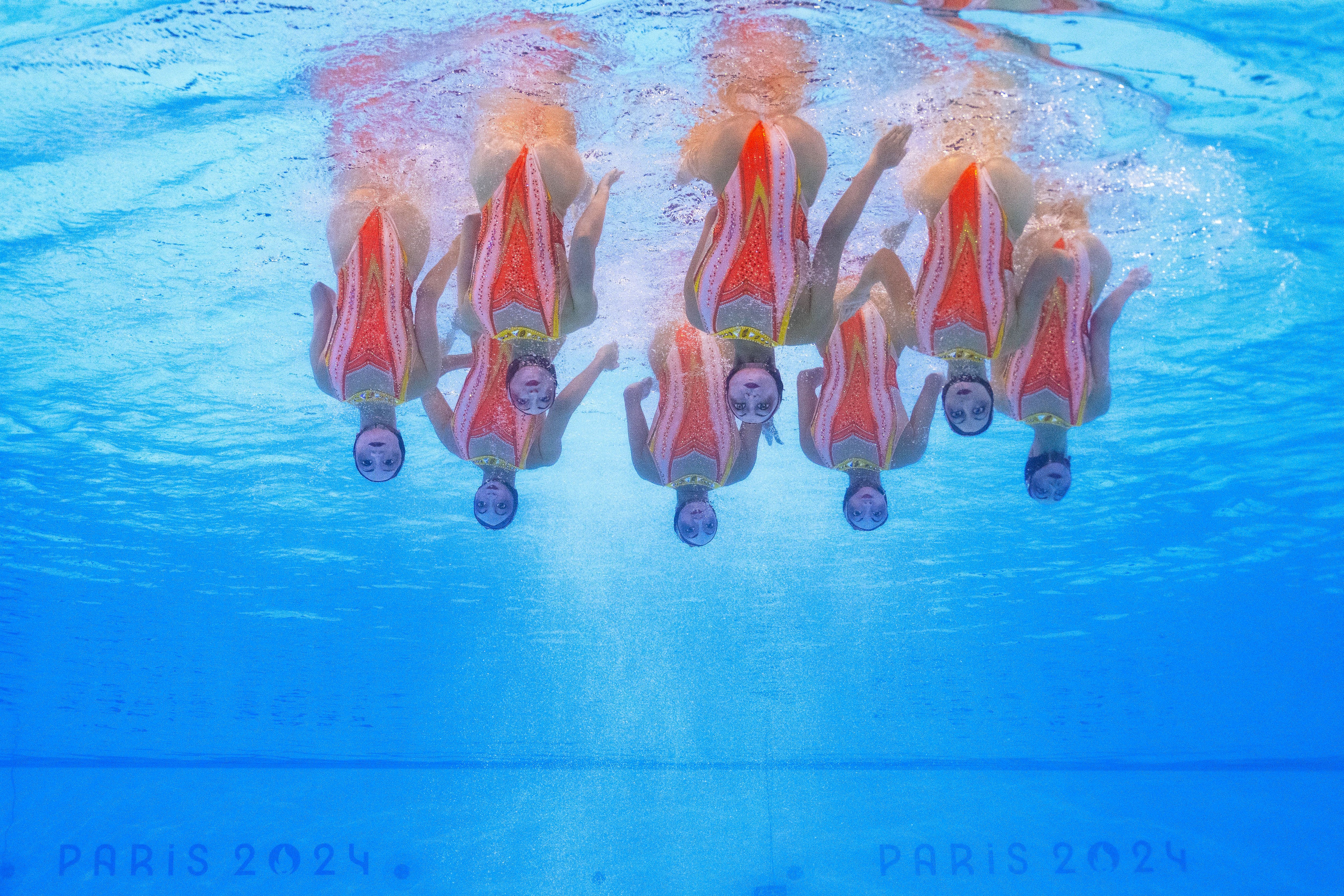 An underwater view shows Team France competing in the team free routine of the artistic swimming event during the Paris 2024 Olympic Games at the Aquatics Centre in Saint-Denis, north of Paris, on August 6, 2024. (Photo by Manan Vatsyayana/AFP Photo)