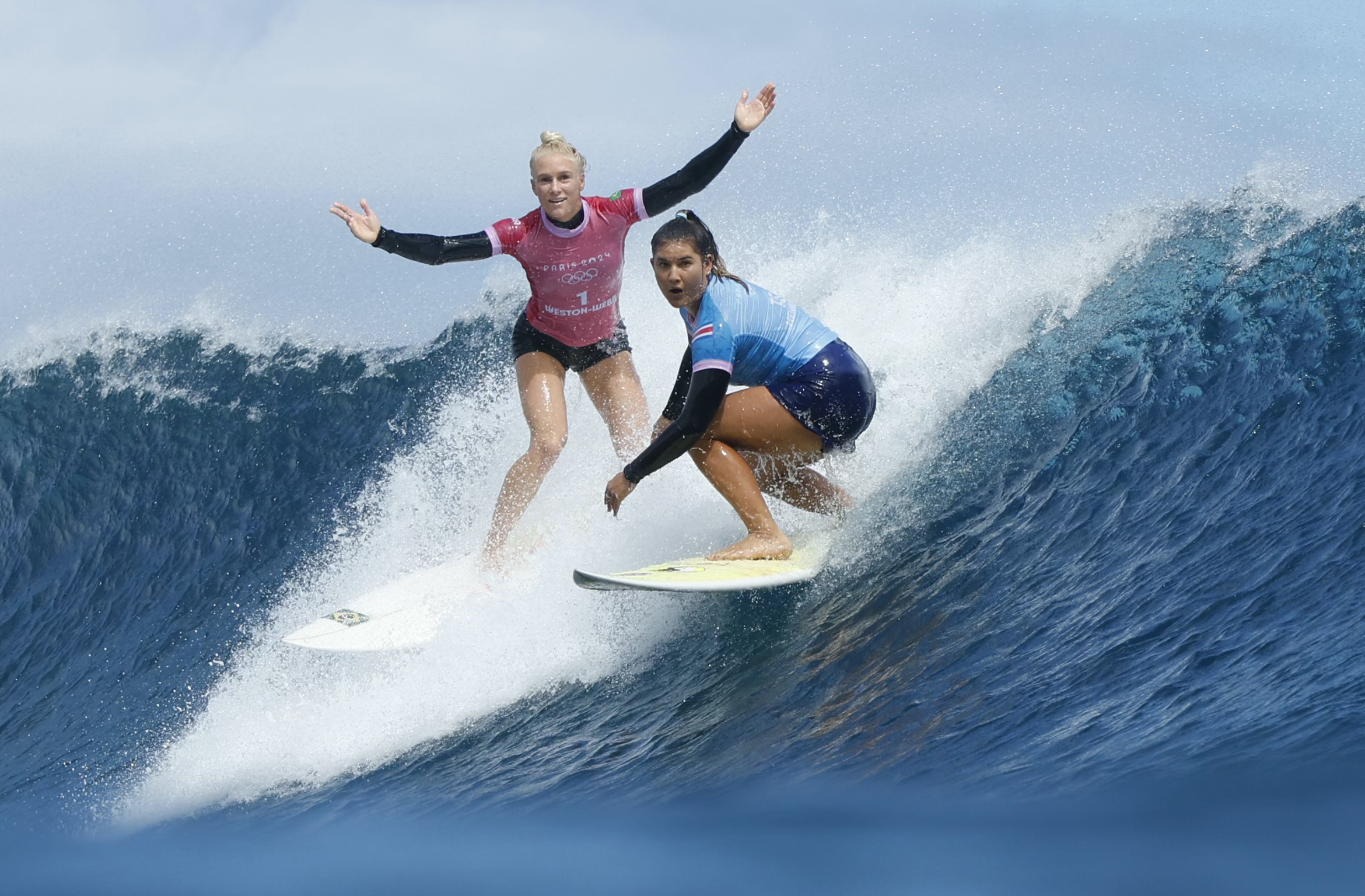 Tatiana Weston-Webb, of Brazil, left, reacts as Brisa Hennessy, of Costa Rica, drops in on her during the semifinal round of the surfing competition at the 2024 Summer Olympics, Monday, August 5, 2024, in Teahupo'o, Tahiti. (Photo by Ben Thouard/Pool Photo via AP Photo)