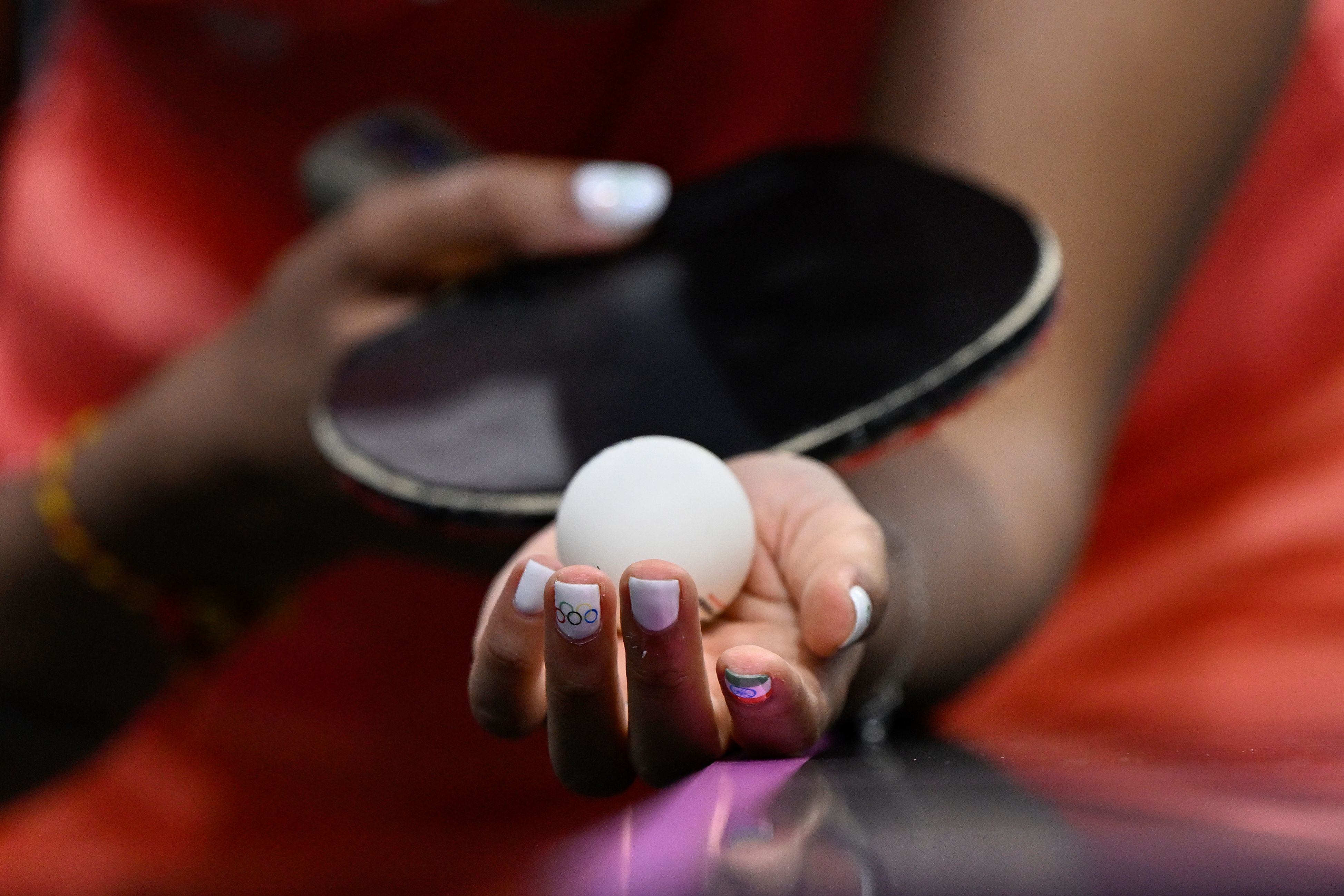 A detailed view of India's Manika Batra's nails painted with the Indian flag and Olympic Rings as she prepares to serve the ball during her women's table tennis singles match in the team quarter-finals between India and Germany at the Paris 2024 Olympic Games at the South Paris Arena in Paris on August 7, 2024. (Photo by Wang Zhao/AFP Photo)