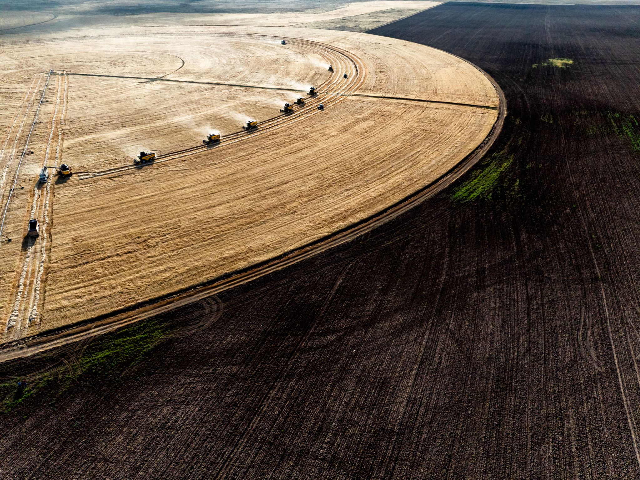An aerial view of farming vehicles harvesting the 492 decares of cereal fields within the Gozlu Agricultural Enterprise, affiliated to the Ministry of Agriculture and Forestry, General Directorate of Agricultural Enterprises (TIGEM) in Konya, Turkiye on July 07, 2024. The yield in the 69 football-field-sized circle fields planting was carried out according to the center pivot robotic irrigation system based on the center of the field. (Photo by Mustafa Ciftci/Anadolu via Getty Images)