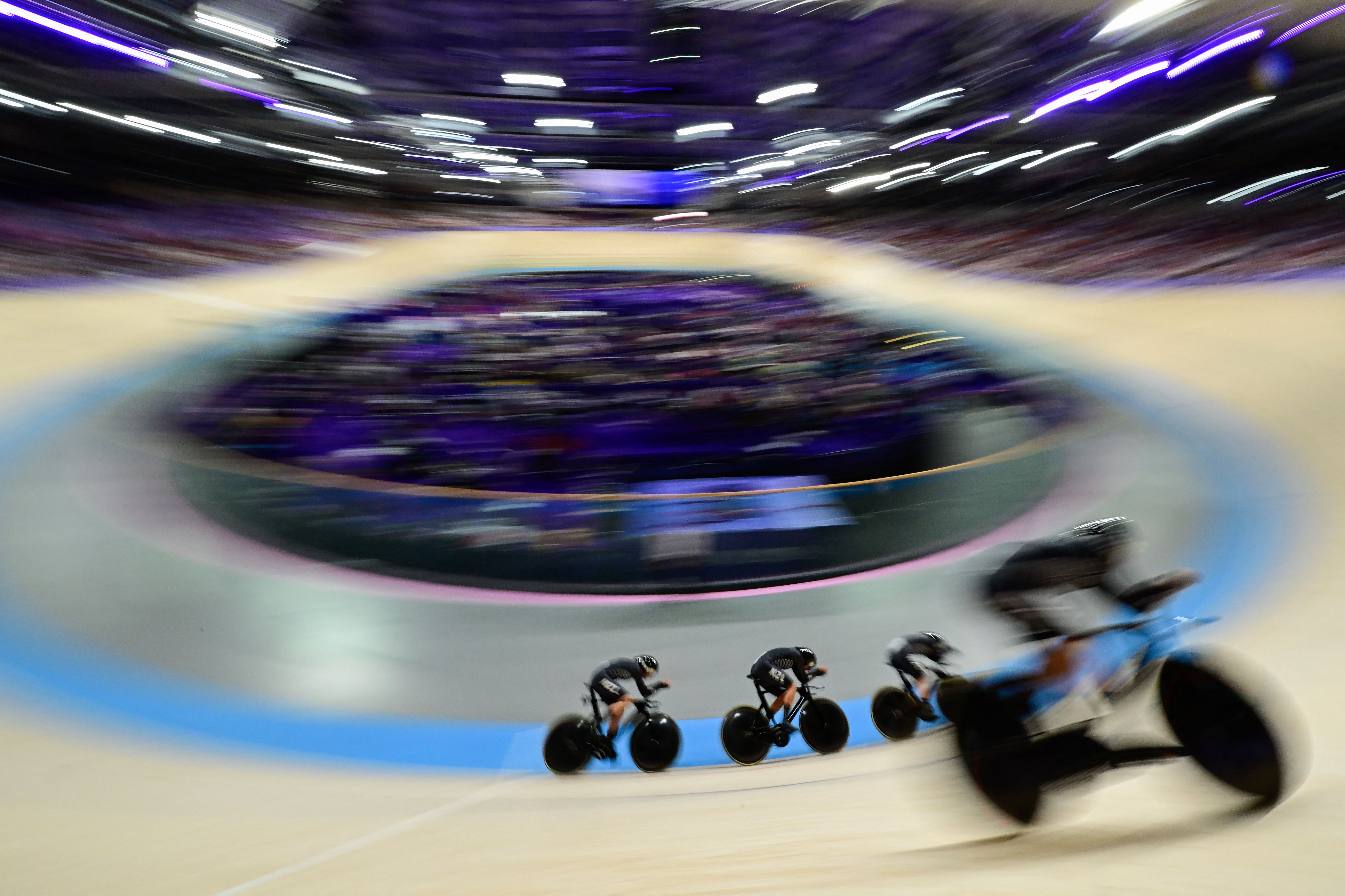 New Zealand's Ally Wollaston, New Zealand's Bryony Botha, New Zealand's Emily Shearman and New Zealand's Nicole Shields compete in a women's track cycling team pursuit first round of the Paris 2024 Olympic Games at the Saint-Quentin-en-Yvelines National Velodrome in Montigny-le-Bretonneux, south-west of Paris, on August 7, 2024. (Photo by John MacDougall/AFP Photo)