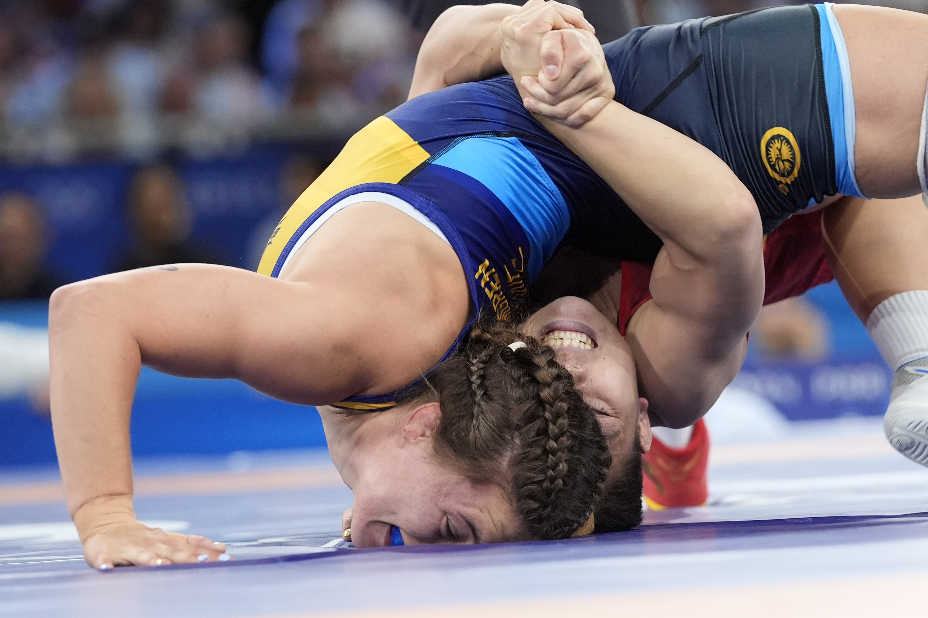 China's Qianyu Pang and Sweden's Emma Jonna Malmgren compete in their women's freestyle 53kg quarterfinal wrestling match, at Champ-de-Mars Arena, during the 2024 Summer Olympics, Wednesday, August 7, 2024, in Paris, France. (Photo by ugene Hoshiko/AP Photo/)