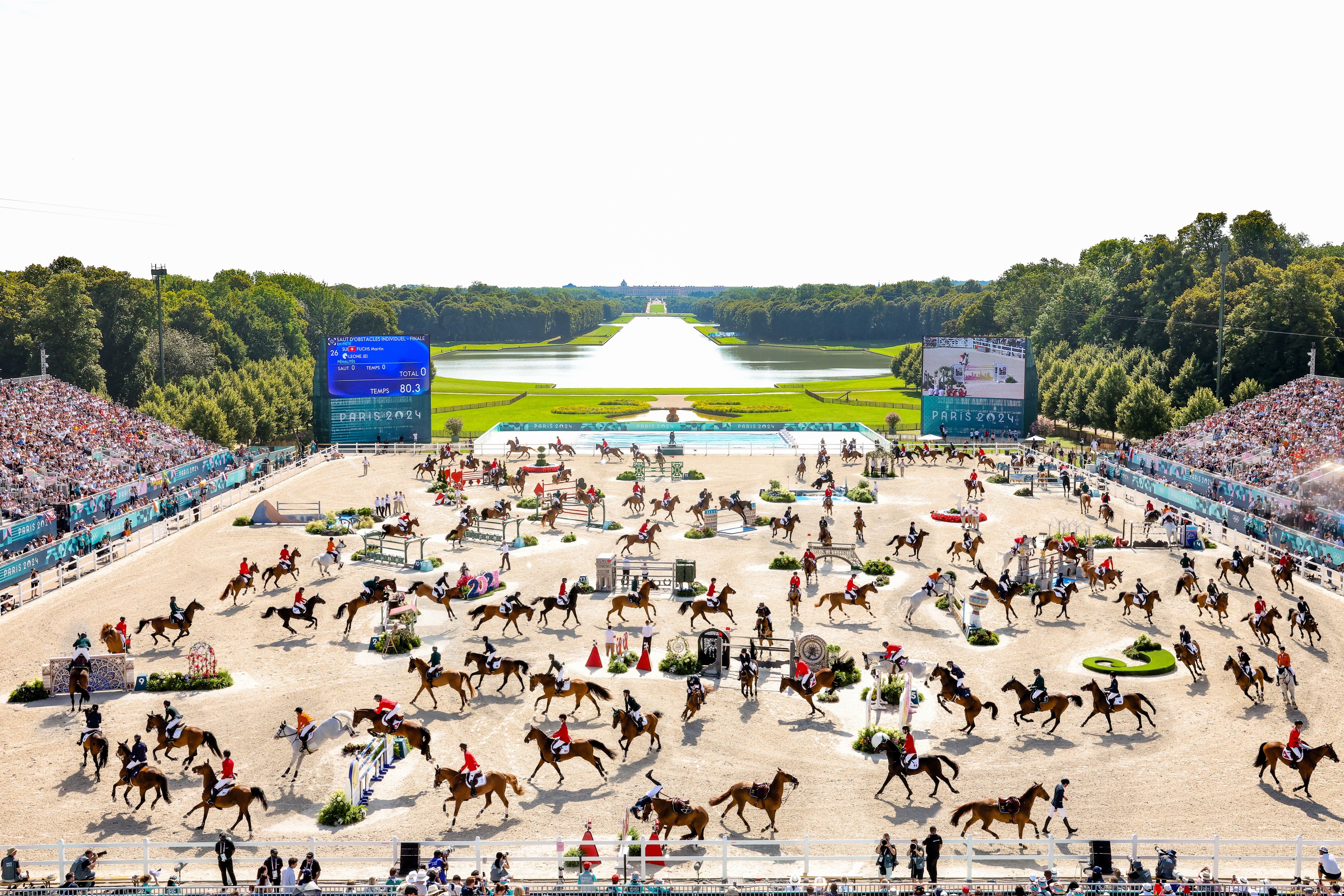 General view of the Jumping Individual Final on day eleven of the Olympic Games Paris 2024 at Chateau de Versailles on August 06, 2024 in Versailles, France. Layers of the Games shows in one image the multiple moments that happen during a game or a day of competition during the Paris 2024 Olympic Games from a fixed camera. (Photo by Hector Vivas/Getty Images)