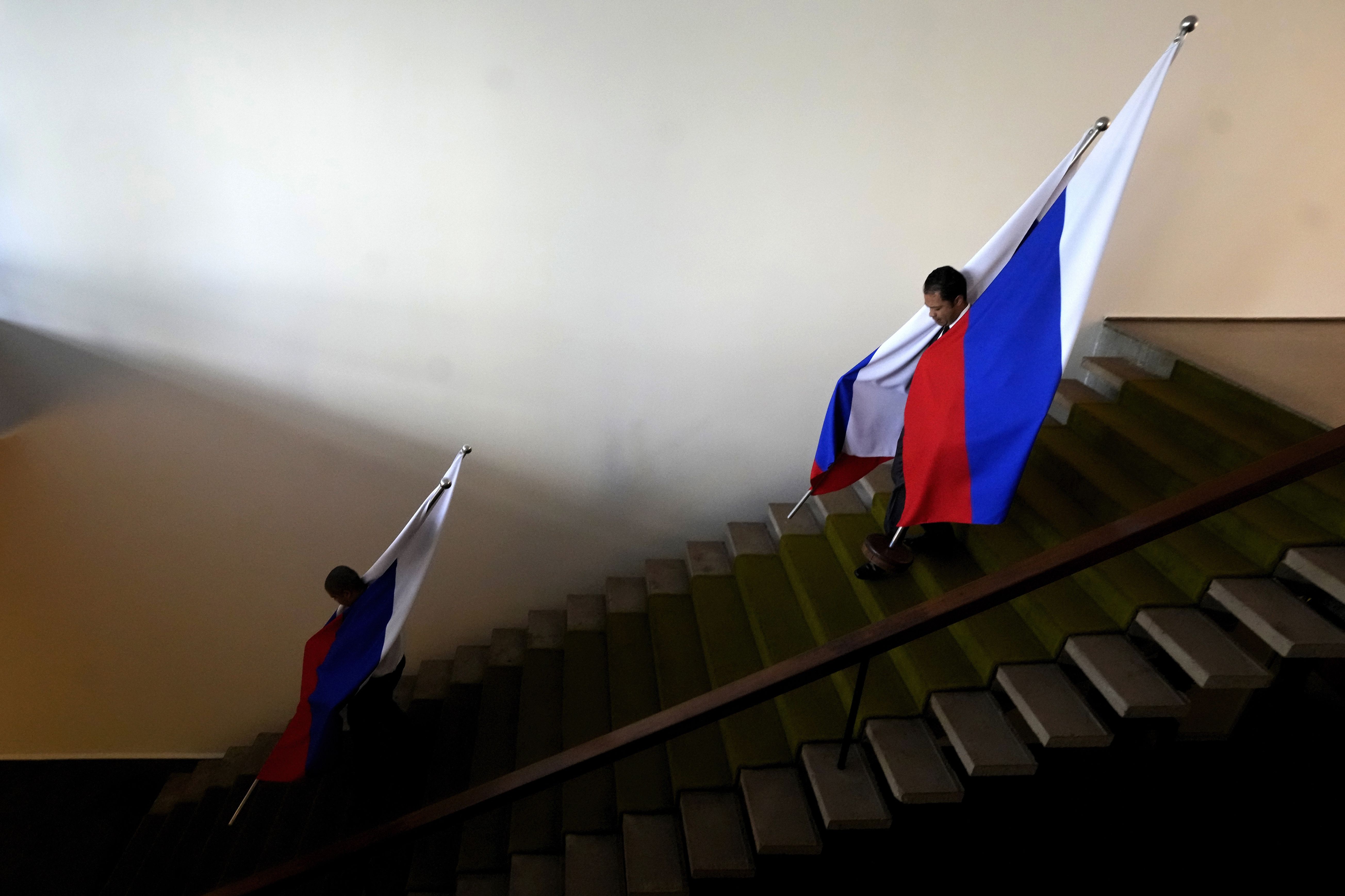 Employees of Itamaraty Palace carry Russian flags in preparations for the arrival of Russian Foreign Minister Sergey Lavrov in Brasilia, Brazil, Monday, April 17, 2023. Lavrov will meet with Brazil's Foreign Minister. (Photo by Eraldo Peres/AP Photo)