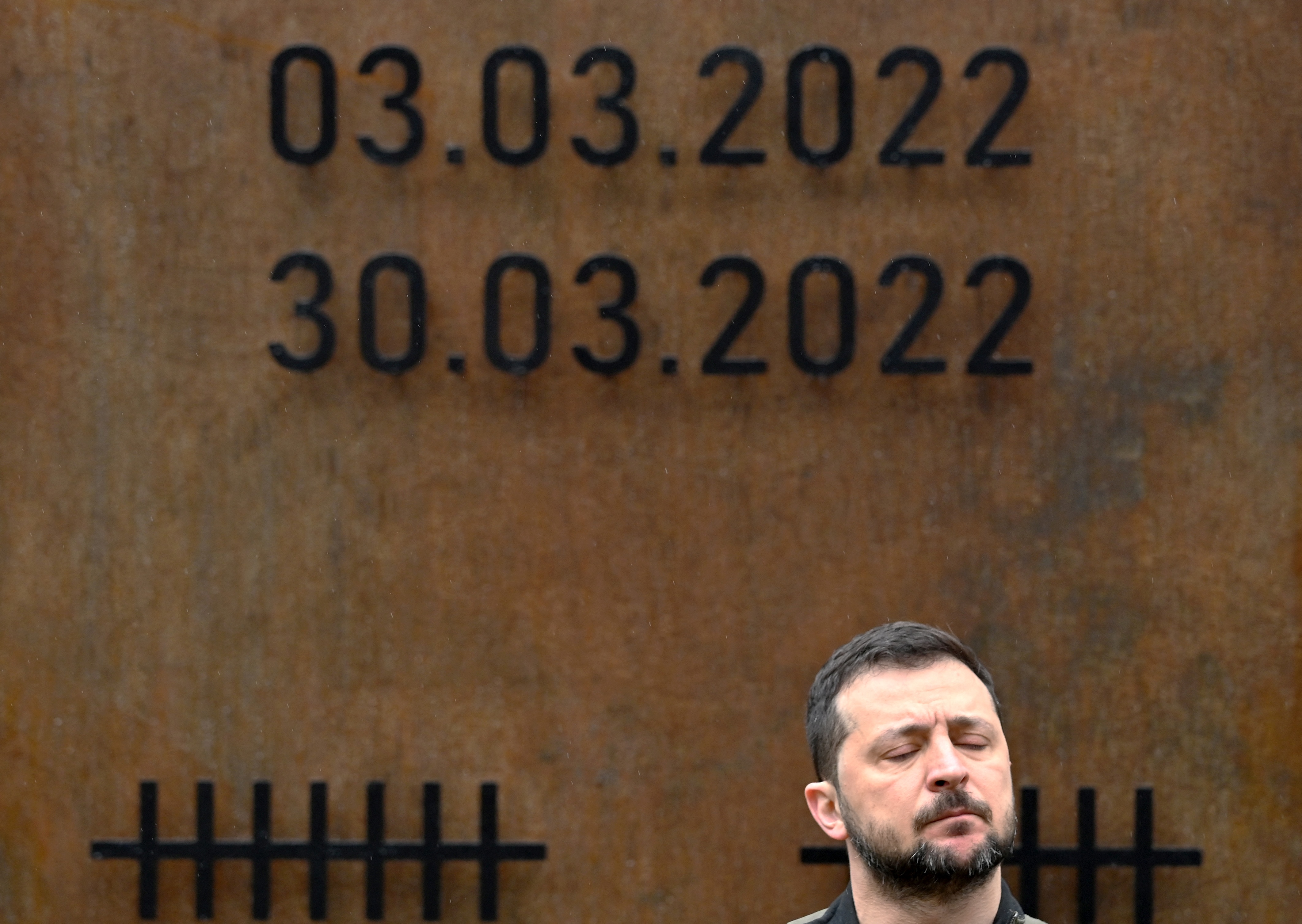 Ukrainian President Volodymyr Zelensky reflects in front of a memorial plaque outside the school in the village of Yahidne, Chernihiv region, in the basement of which the residents were jailed during the Russian occupation on April 3, 2023 during a visit to mark the first anniversary of the village liberation, amid the Russian invasion of Ukraine. (Photo by Sergei Supinsky/AFP Photo)