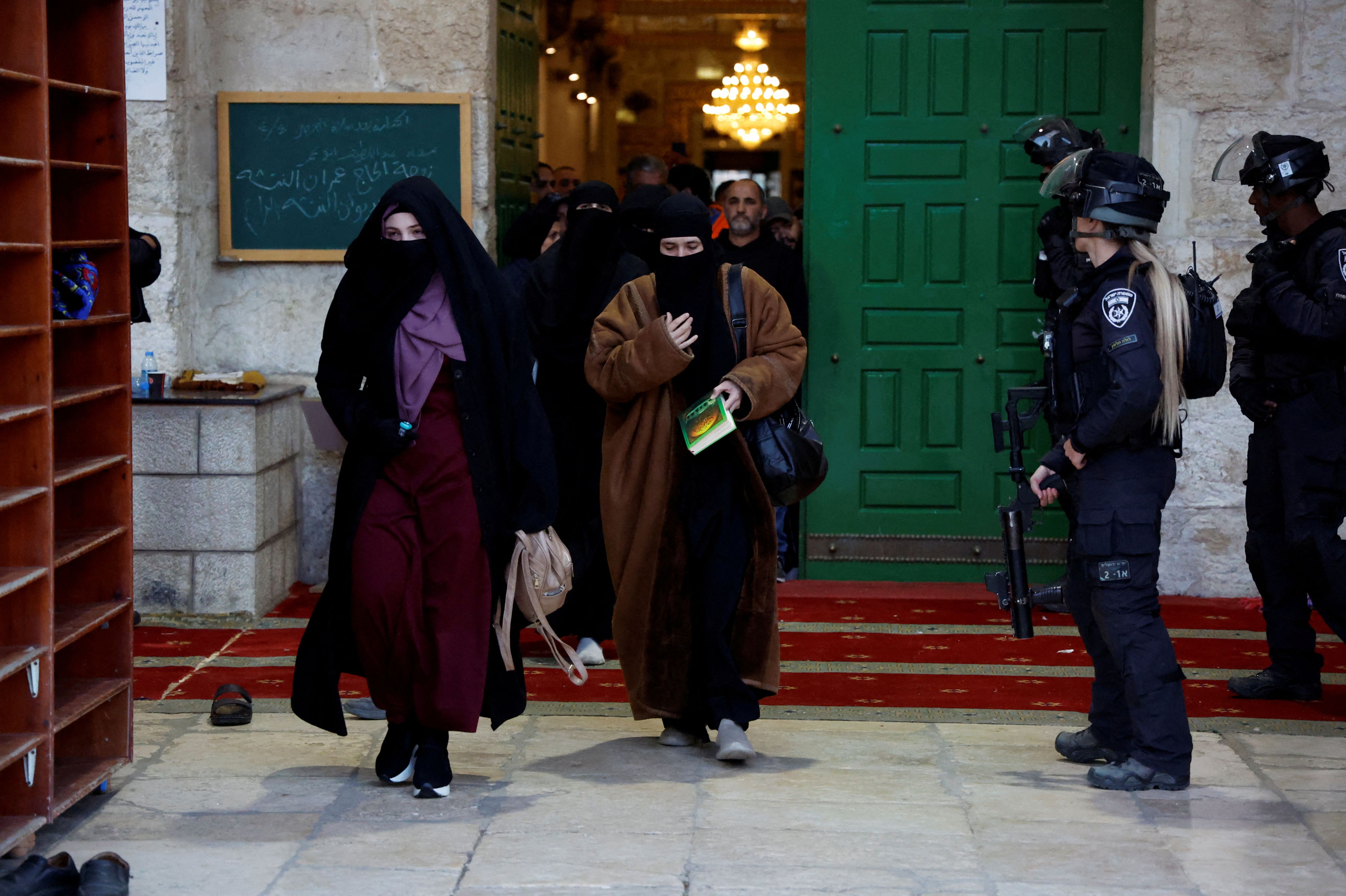 Israeli border police stand guard at the Al-Aqsa compound, also known to Jews as the Temple Mount, while tension arises during clashes with Palestinians in Jerusalem's Old City on April 5, 2023. (Photo by Ammar Awad/Reuters)