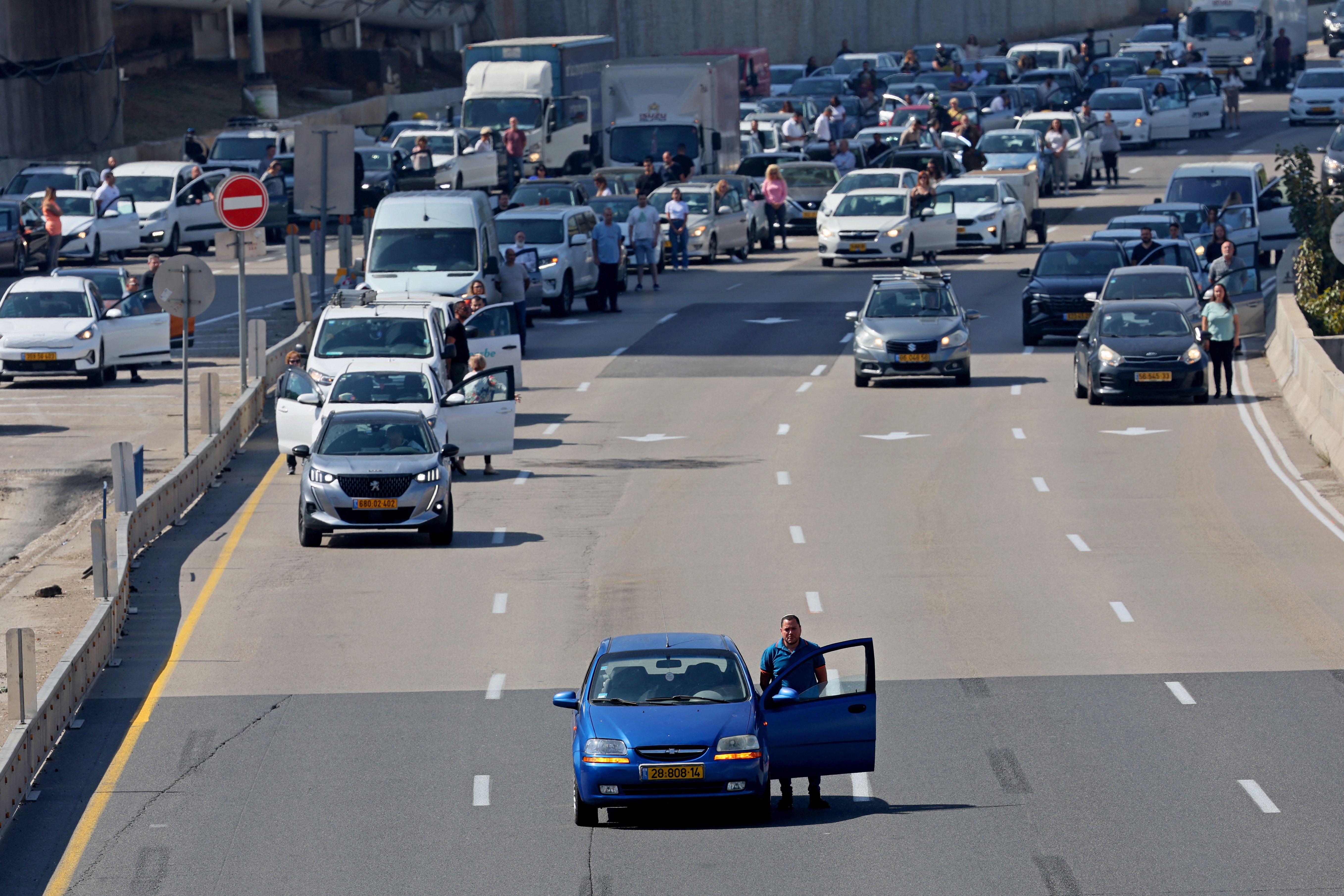 Drivers stand still in Tel Aviv on April 18, 2023 as sirens blare for two minutes marking Israel's annual Holocaust Remembrance Day in memory of the six million Jews killed during World War II. (Photo by Jack Guez/AFP Photo)