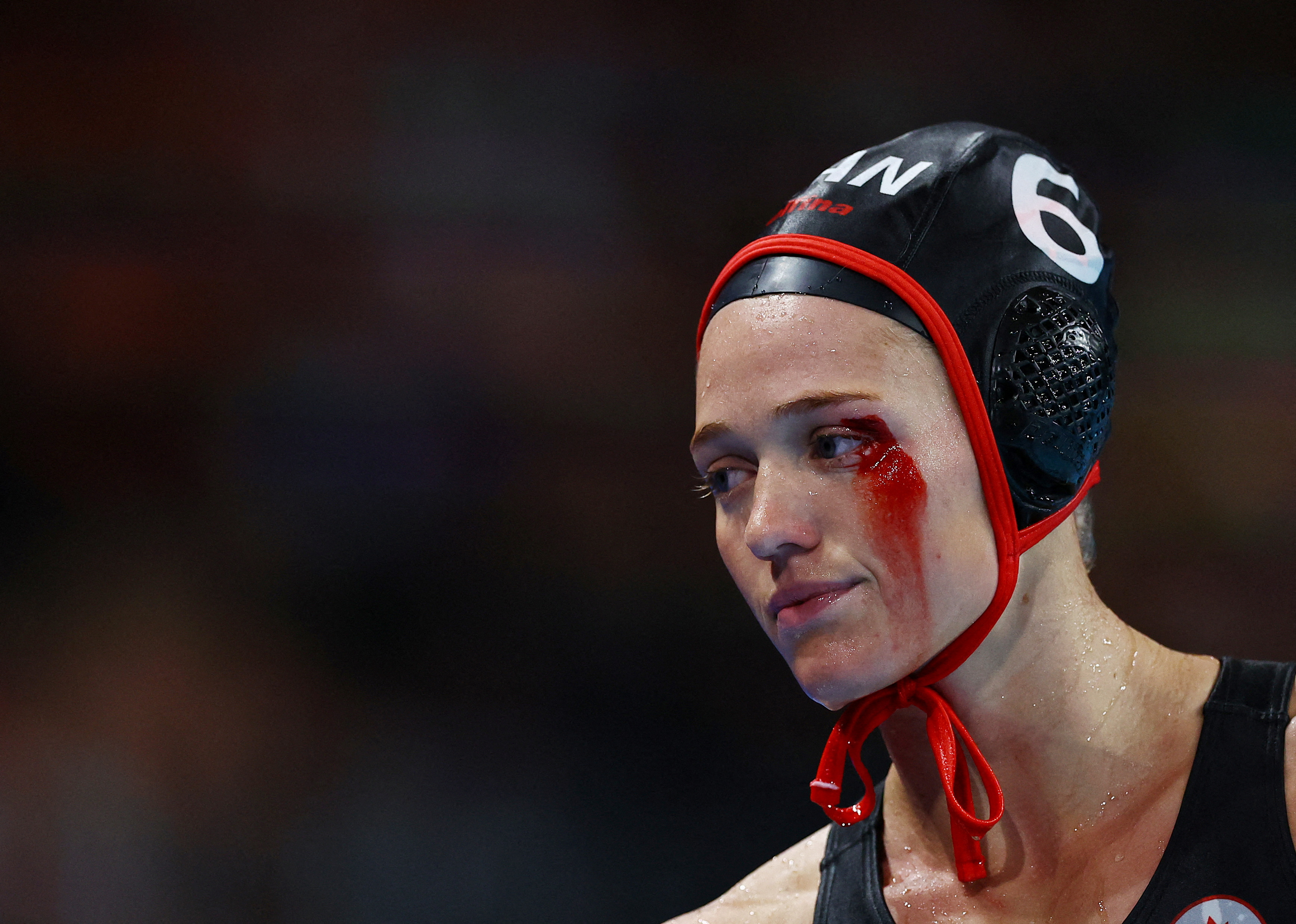 Canada's #06 Blaire Mcdowell bleeds due to an injury in the women's water polo 5th-8th classification match between Italy and Canada during the Paris 2024 Olympic Games at the Paris La Defense Arena in Nanterre, on August 8, 2024. (Photo by Evgenia Novozhenina/Reuters)
