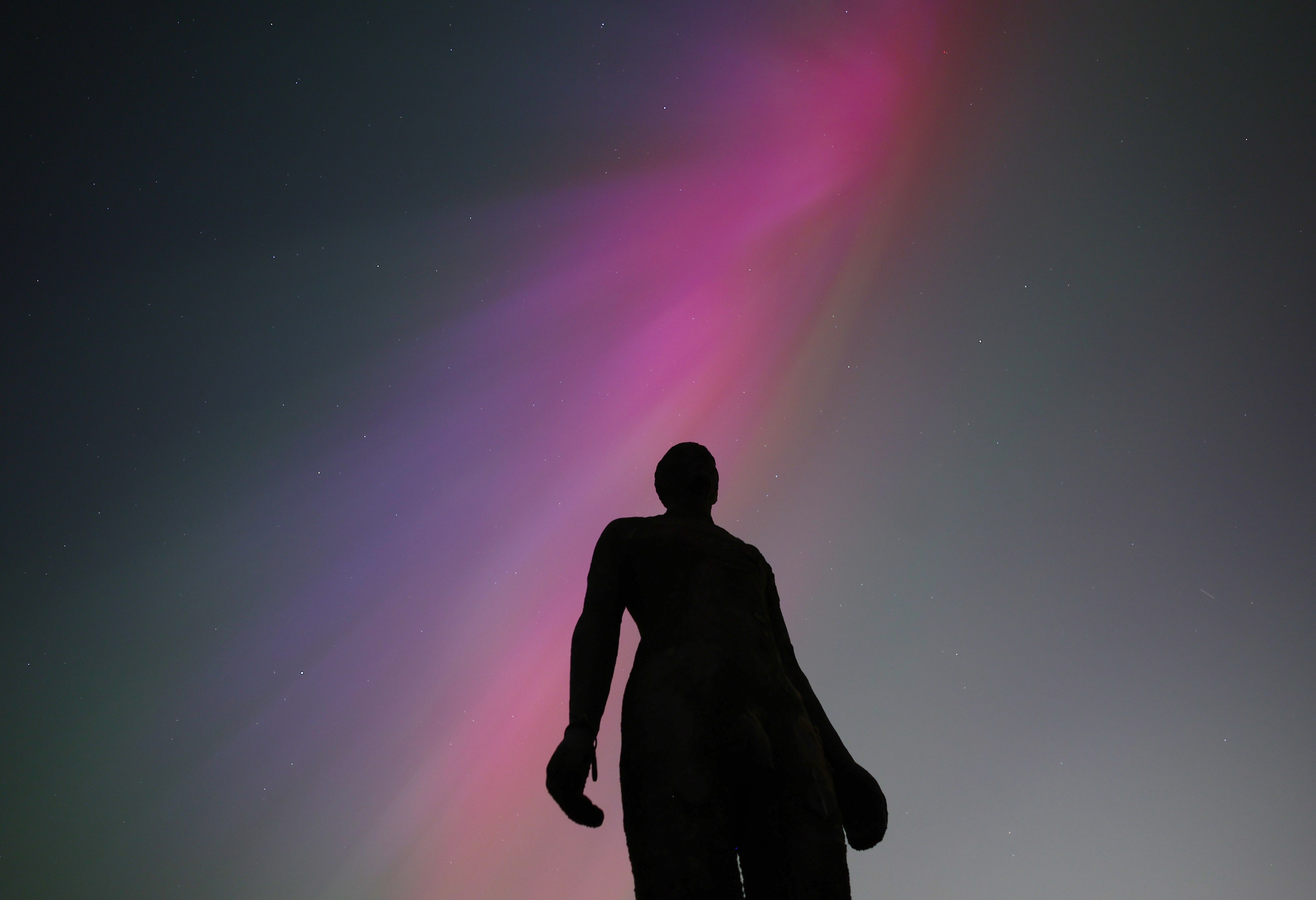 The Aurora Borealis, known as the Northern Lights, is visible behind Anthony Gormley's “Another Place” sculpture in Crosby, Britain, 10 May 2024. (Photo by Adam Vaughan/EPA/EFE/Rex Features/Shutterstock)