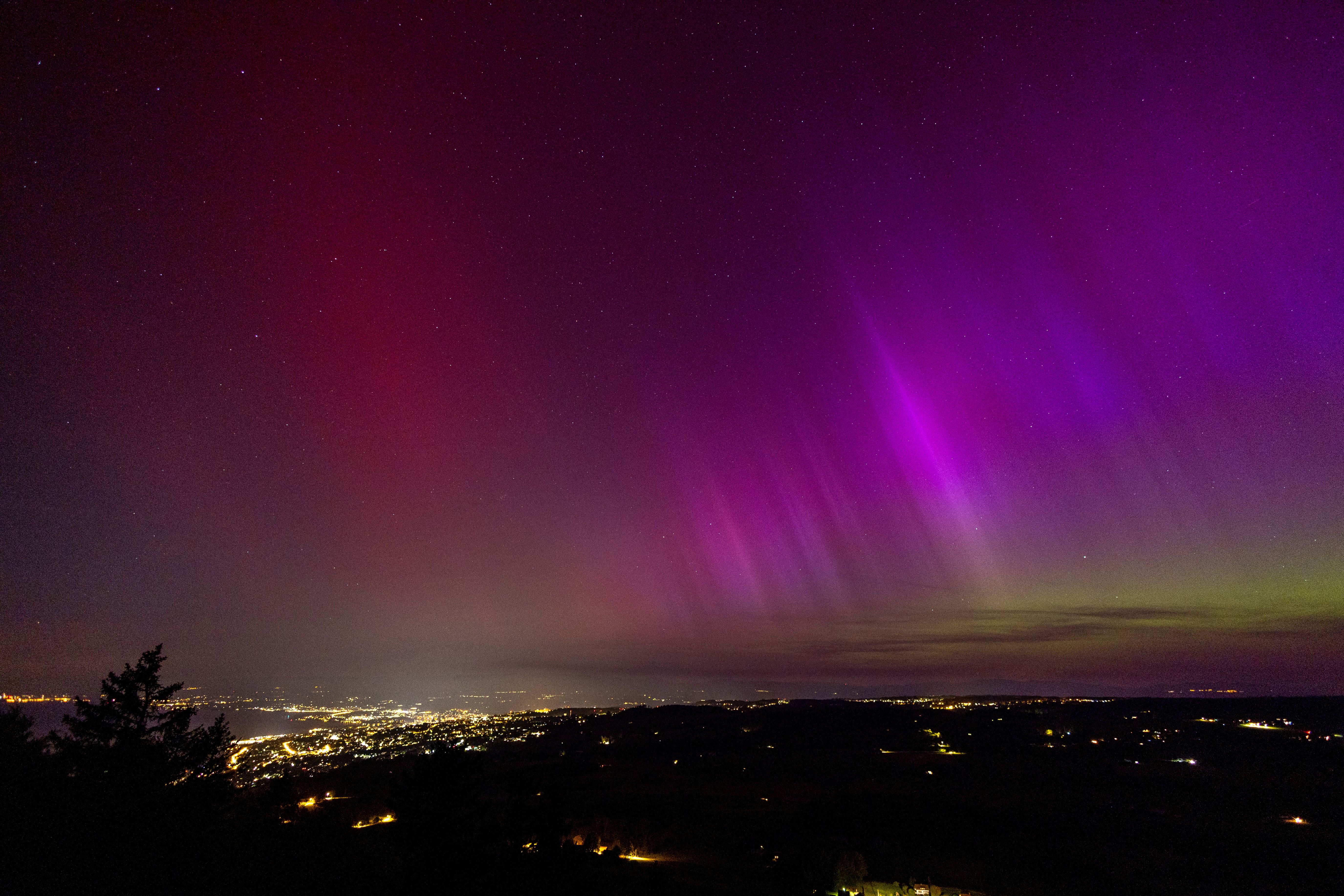 An aurora borealis is seen above Lausanne and the Jura from the Tour de Gourze in Riex, Switzerland, on May 11, 2024. (Photo by Denis Balibouse/Reuters)