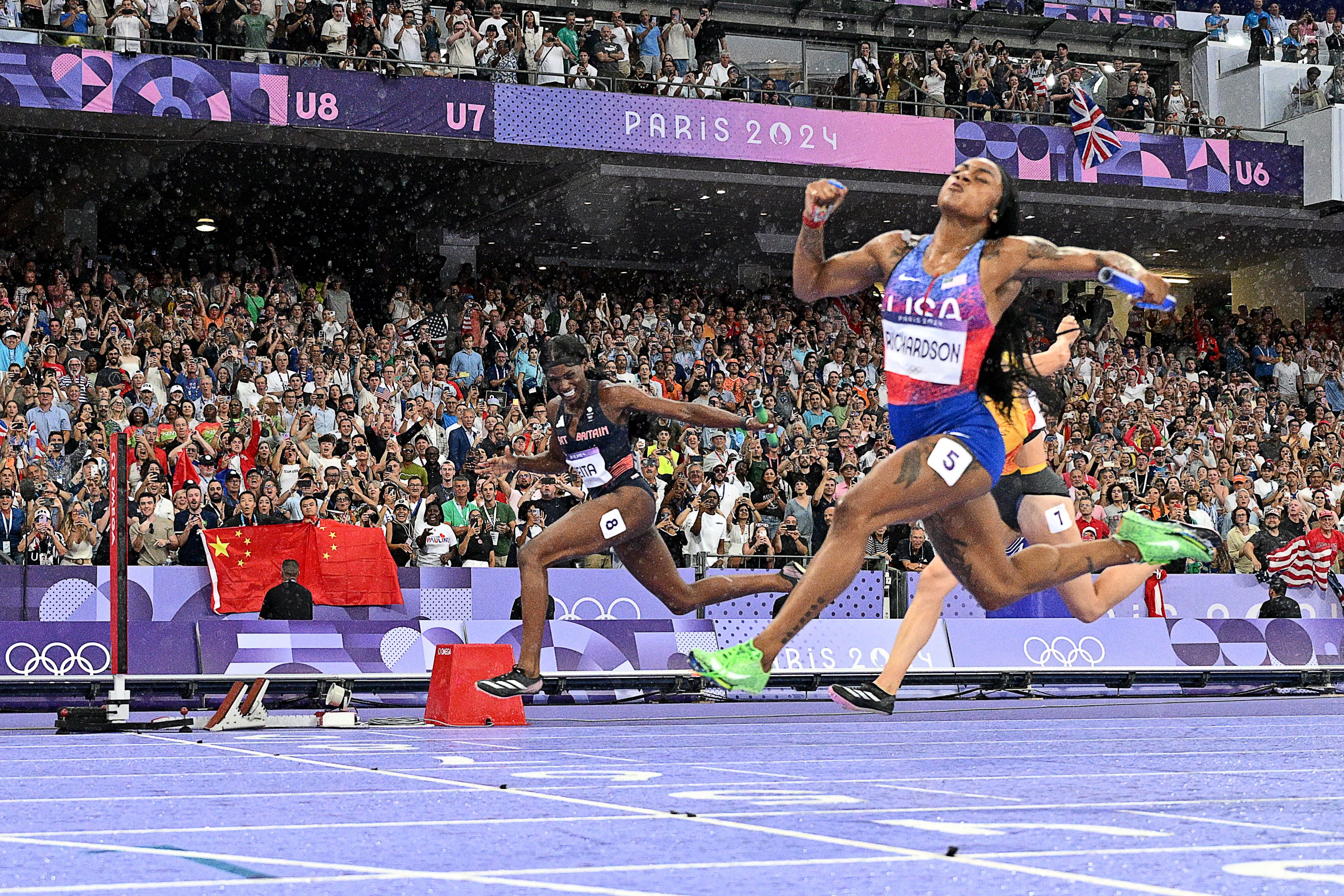 US' Sha'Carri Richardson crosses the finish line to win the women's 4x100m relay final of the athletics event at the Paris 2024 Olympic Games at Stade de France in Saint-Denis, north of Paris, on August 9, 2024. (Photo by Jewel Samad/AFP Photo)