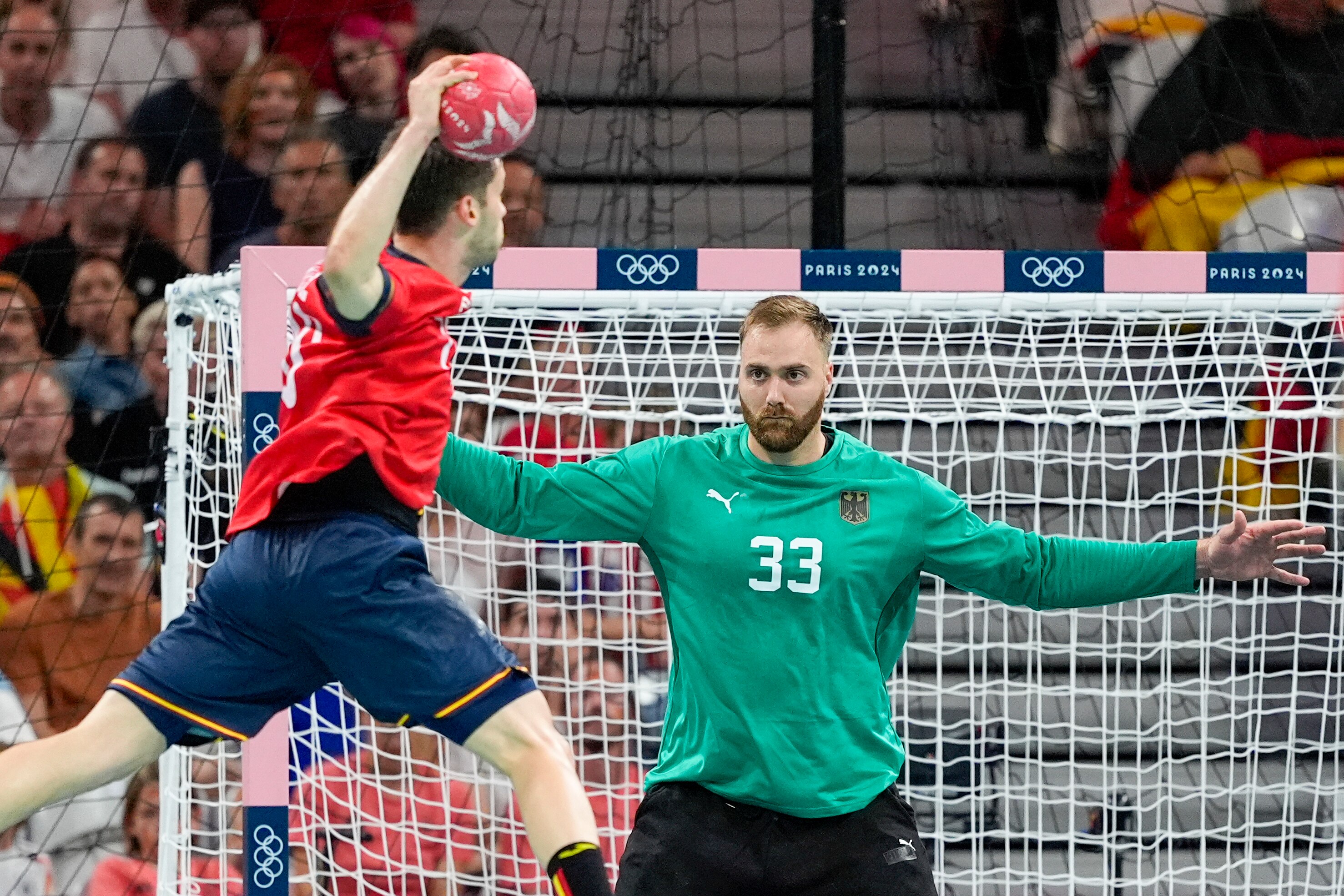 Spain's Daniel Fernandez shoots on goal during a semifinal handball match between Germany and Spain at the 2024 Summer Olympics, Friday, August 9, 2024, in Villeneuve-d'Ascq, France. (Photo by Aaron Favila/AP Photo)