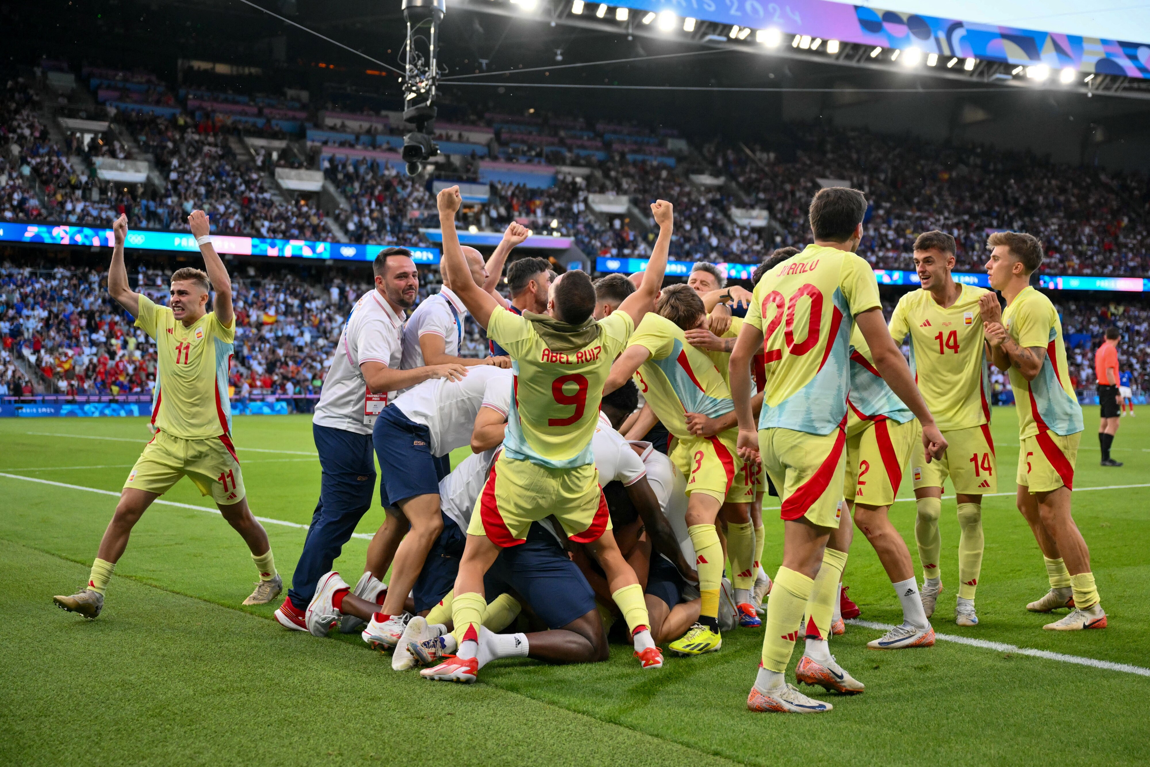 Spain's players celebrate victory at the end of the men's gold medal final football match between France and Spain during the Paris 2024 Olympic Games at the Parc des Princes in Paris on August 9, 2024. Spain won 3-5. (Photo by Luis Robayo/AFP Photo)