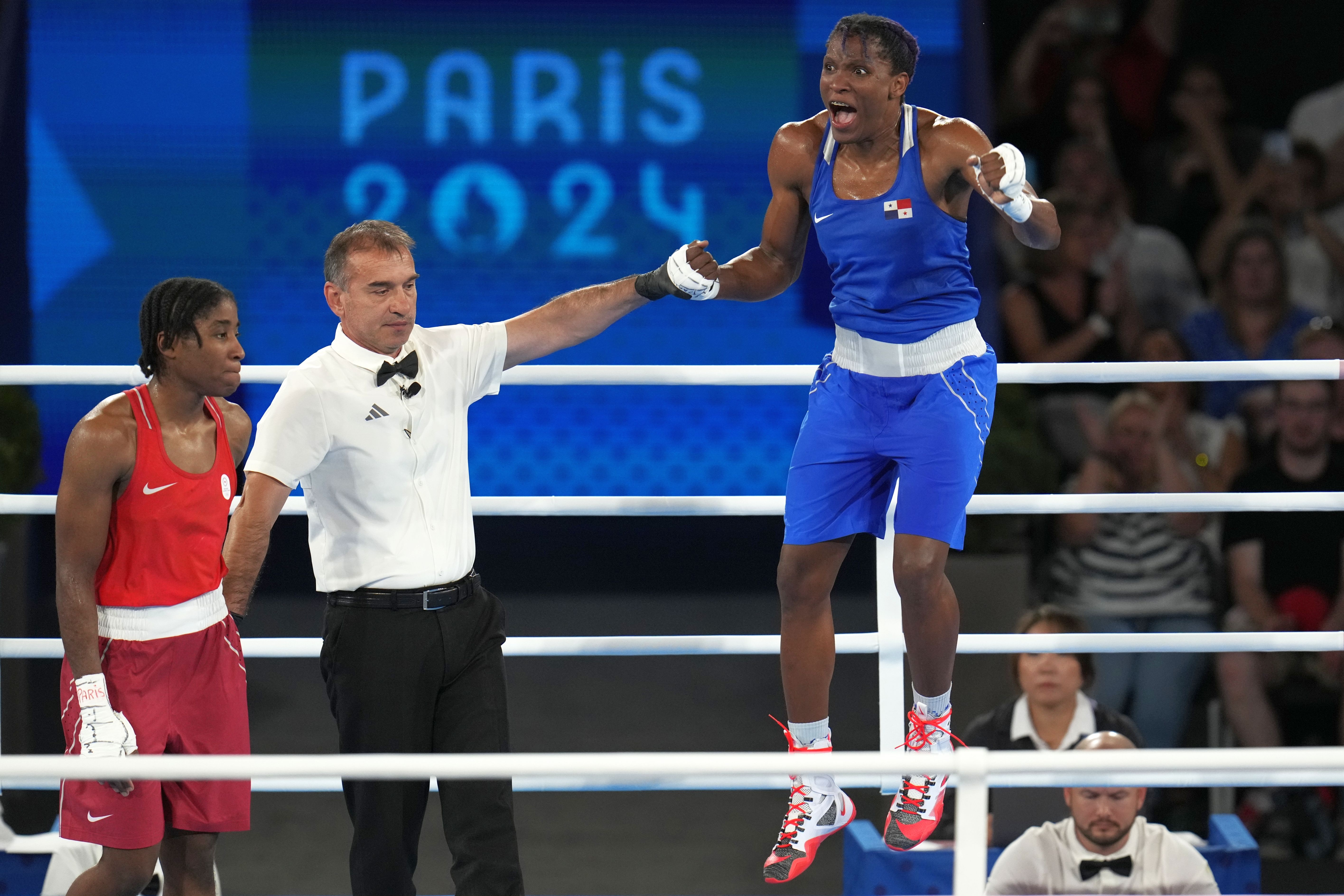 Panama's Atheyna Bylon, right, celebrates after defeating Refugee Olympic Team's Cindy Ngamba in their women's 75 kg semifinal boxing match at the 2024 Summer Olympics, Thursday, August 8, 2024, in Paris, France. (Photo by Ariana Cubillos/AP Photo)