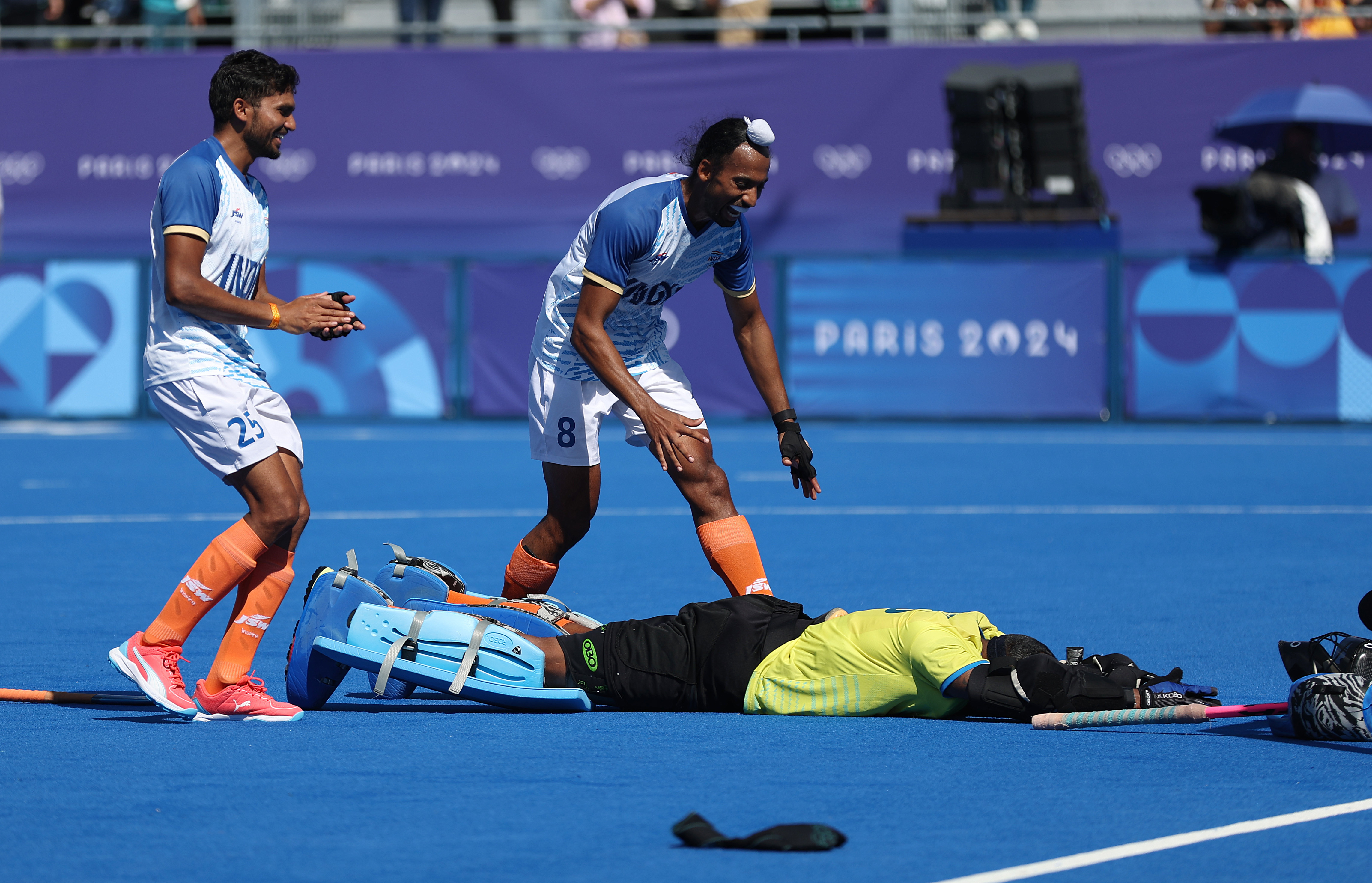 Raj Kumar Pal (L) Hardik Singh (C) and Sreejesh Parattu Raveendran of Team India celebrate following victory in during the Men's Bronze Medal match between India and Spain on day thirteen of the Olympic Games Paris 2024 at Stade Yves Du Manoir on August 08, 2024 in Paris, France. (Photo by Maja Hitij/Getty Images)