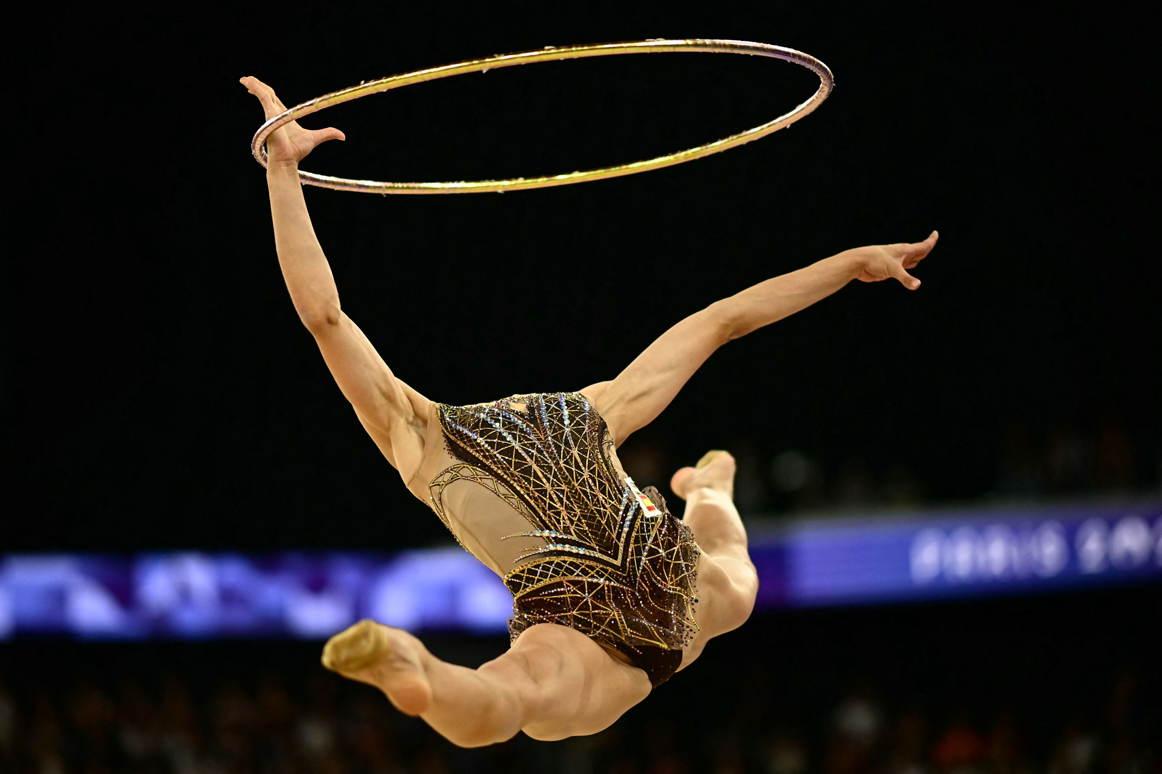 Spain's Polina Berezina as she competes in the rhytmic gymnastics' individual all-around qualification during the Paris 2024 Olympic Games at the Porte de la Chapelle Arena in Paris, on August 8, 2024. (Photo by Loic Venance/AFP Photo)