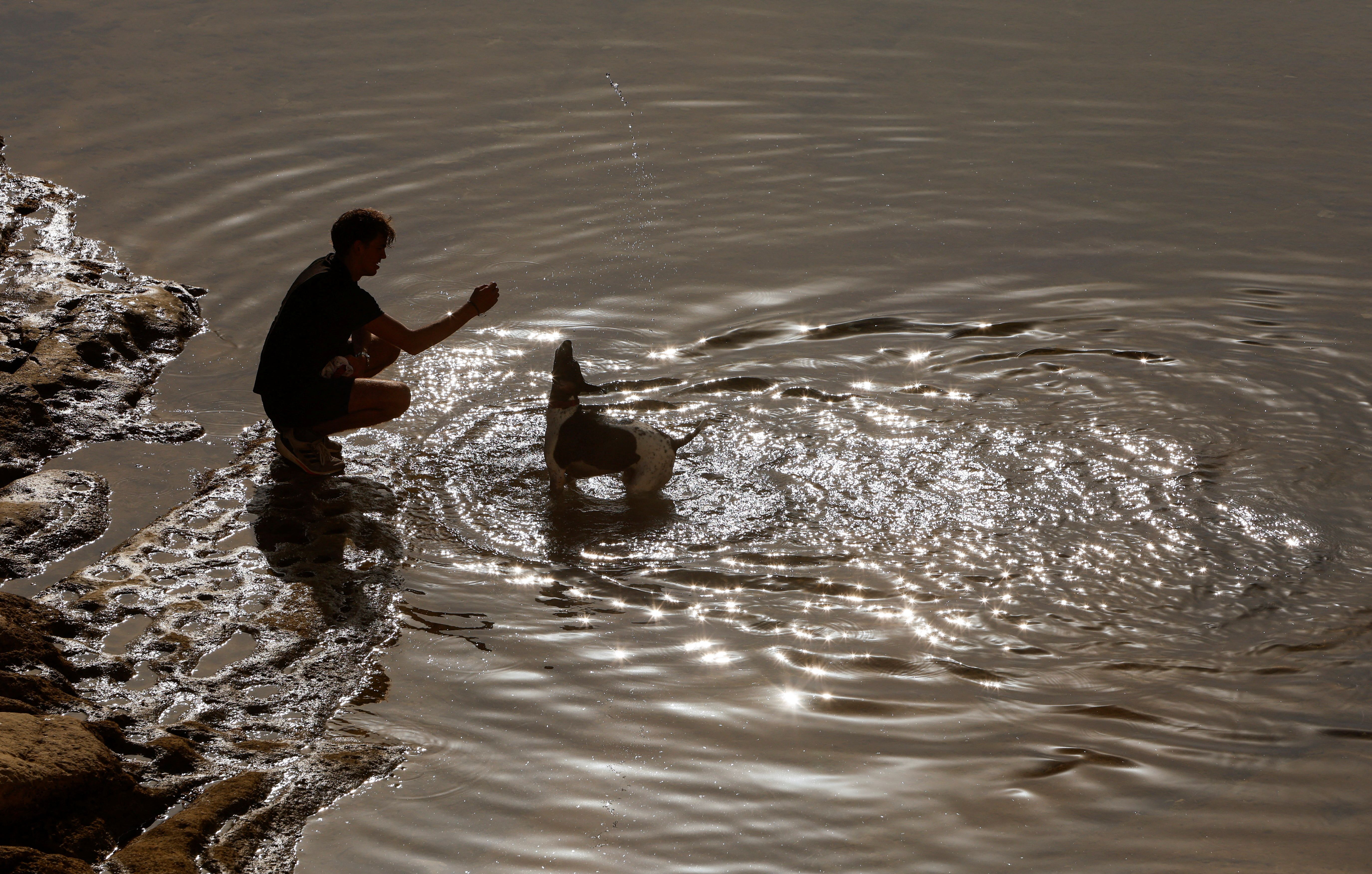 A man plays with his dog as they cool down in a rock pool after the Malta Airport MetOffice issued an orange alert for the Maltese islands because of rising temperatures, in Sliema, Malta on August 3, 2024. (Photo by Darrin Zammit Lupi/Reuters)