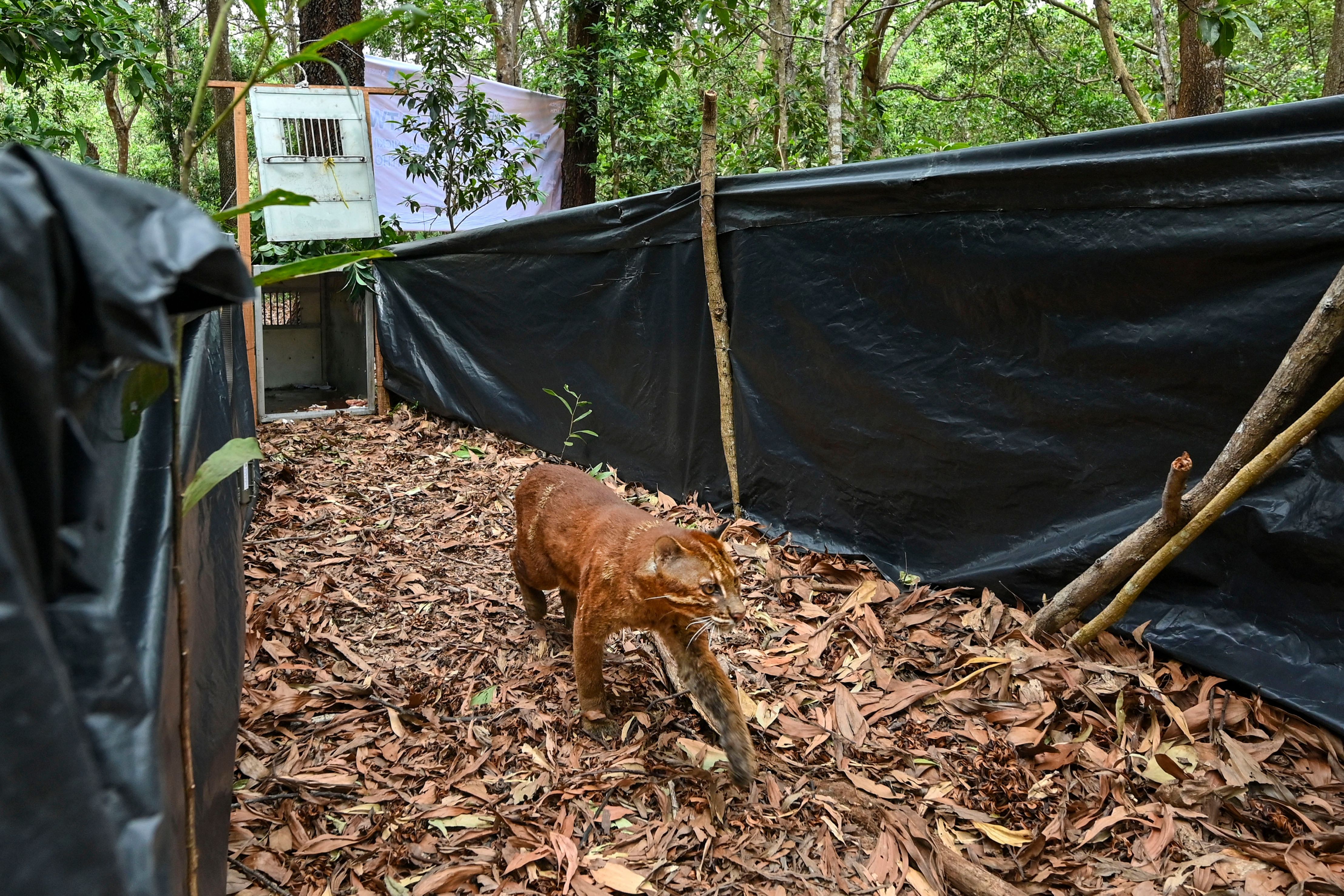 An Asian golden cat walks out from a box as it is released back into the wild after being treated for injuries by the Indonesian nature and conservation agency (BKSDA) after being caught by a poacher, in Jantho forest, Indonesia's Aceh province, on July 31, 2024. (Photo by Chaideer Mahyuddin/AFP Photo)