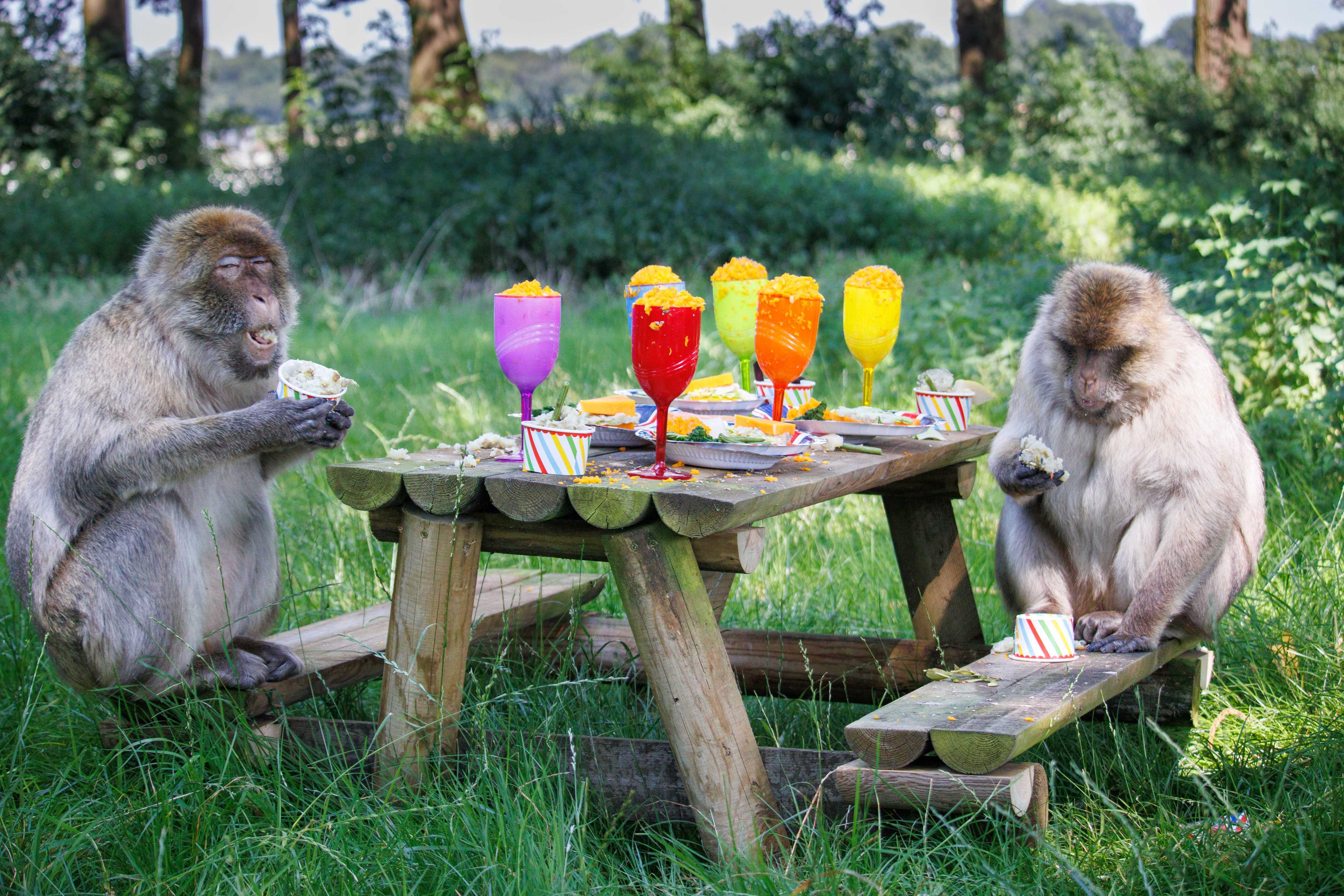A pair of Barbary macaques make the most of their summer feast at Woburn Safari Park in Bedfordshire, UK in the first decade of August 2024, featuring potato ice creams and mashed vegetable cocktails. (Photo by Woburn Safari Park/Cover Images)
