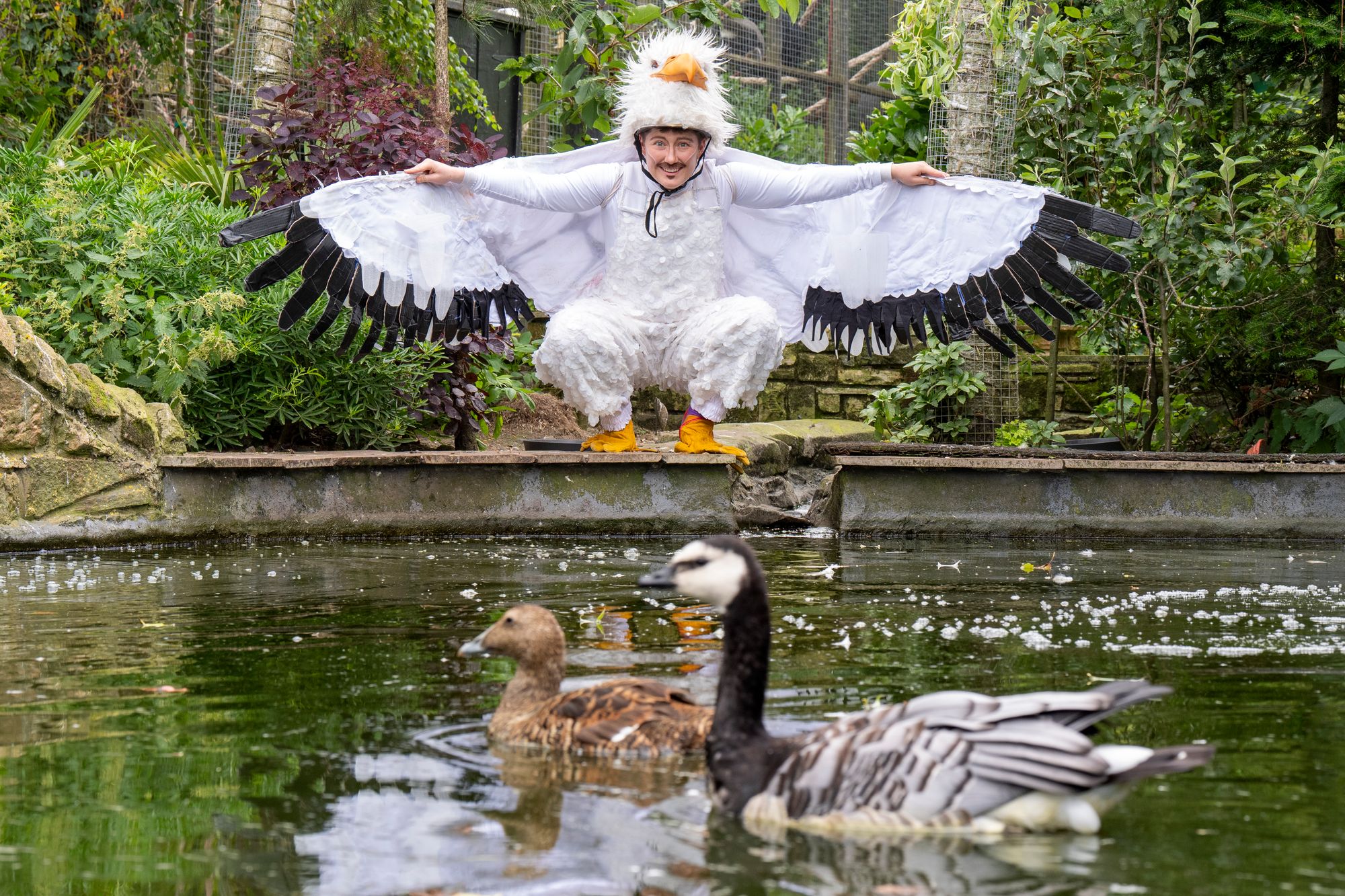 Dressed as an albatross, award-winning drag king Bi-Curious George meets the birds in the Five Sisters Zoo aviary, West Lothian, ahead of their appearance in Queer Planet at the Pleasance Dome at the Edinburgh Fringe Festival on Wednesday, August 7, 2024. (Photo by Jane Barlow/PA Images via Getty Images)