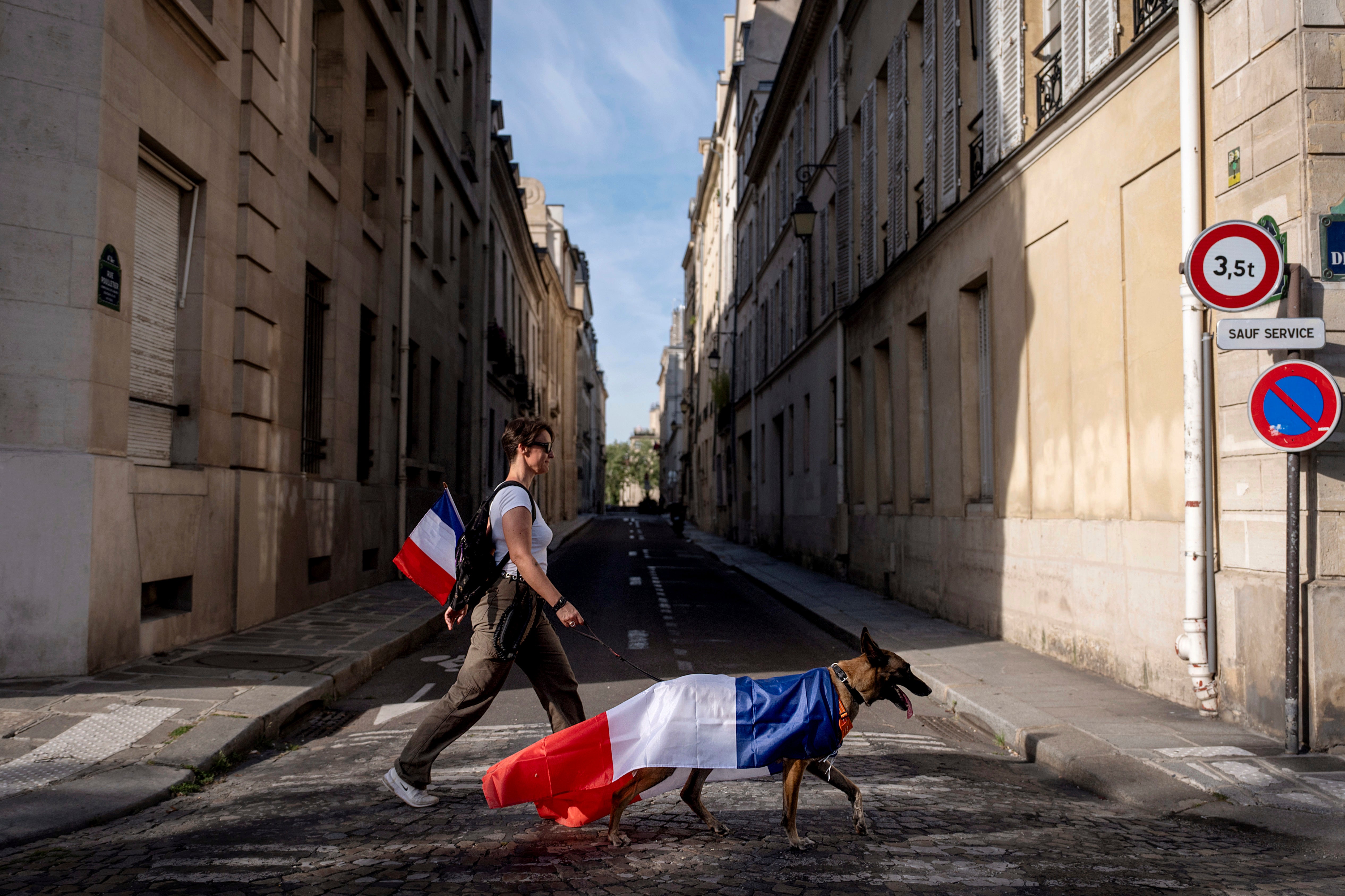 Alexandra Jezequel walks with her dog, Oban, draped in the flag of France, as she walks through the streets of Paris, France, Sunday, August 4, 2024, during the 2024 Summer Olympics. (Photo by David Goldman/AP Photo)