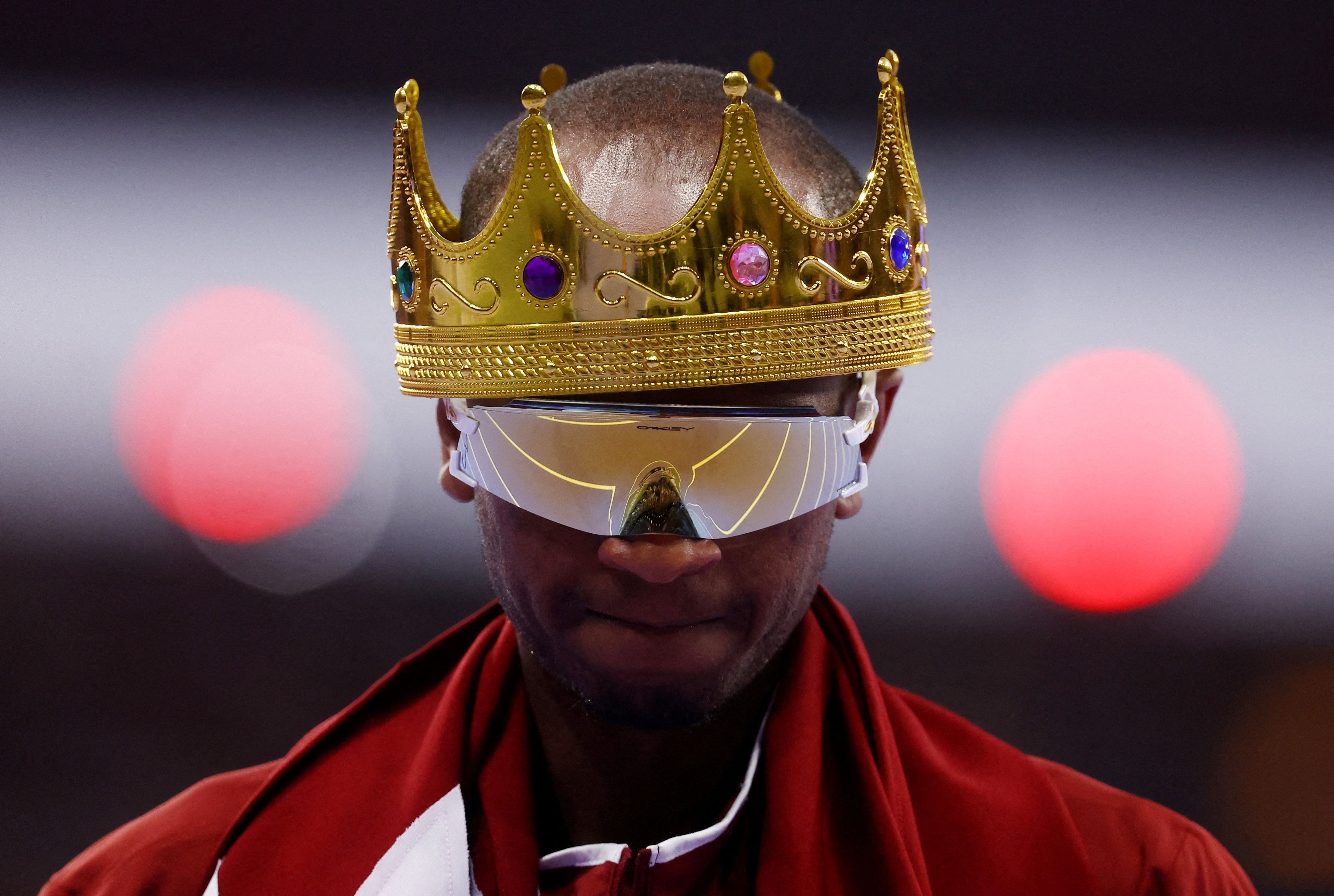 Bronze medallist Qatar's Mutaz Essa Barshim wears a crown as he celebrates competing in the men's high jump final of the athletics event at the Paris 2024 Olympic Games at Stade de France in Saint-Denis, north of Paris, on August 10, 2024. (Photo by Hannah Mckay/Reuters)